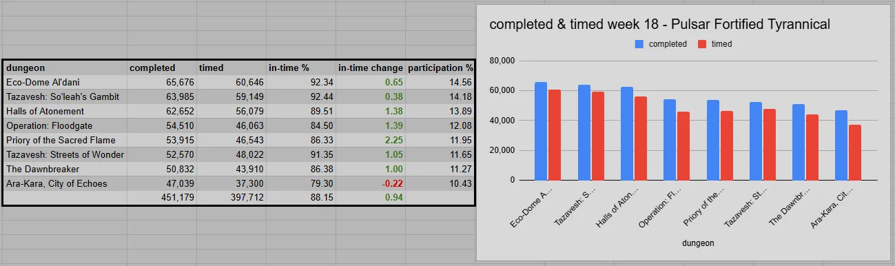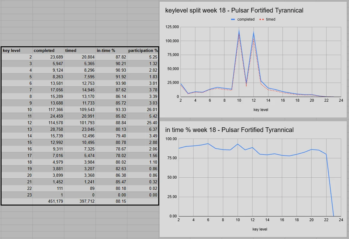 The split across all dungeons was almost unchanged. The order only shuffled slightly, with Floodgate rising from rank 7 to rank 4. The overall success rate climbed by 0.94 percentage points to 88.15%. The Pulsar affix is much easier to deal with than Ascendant was the previous week. It is still surprising how much better Priory performed despite Fortified being active on more key levels.