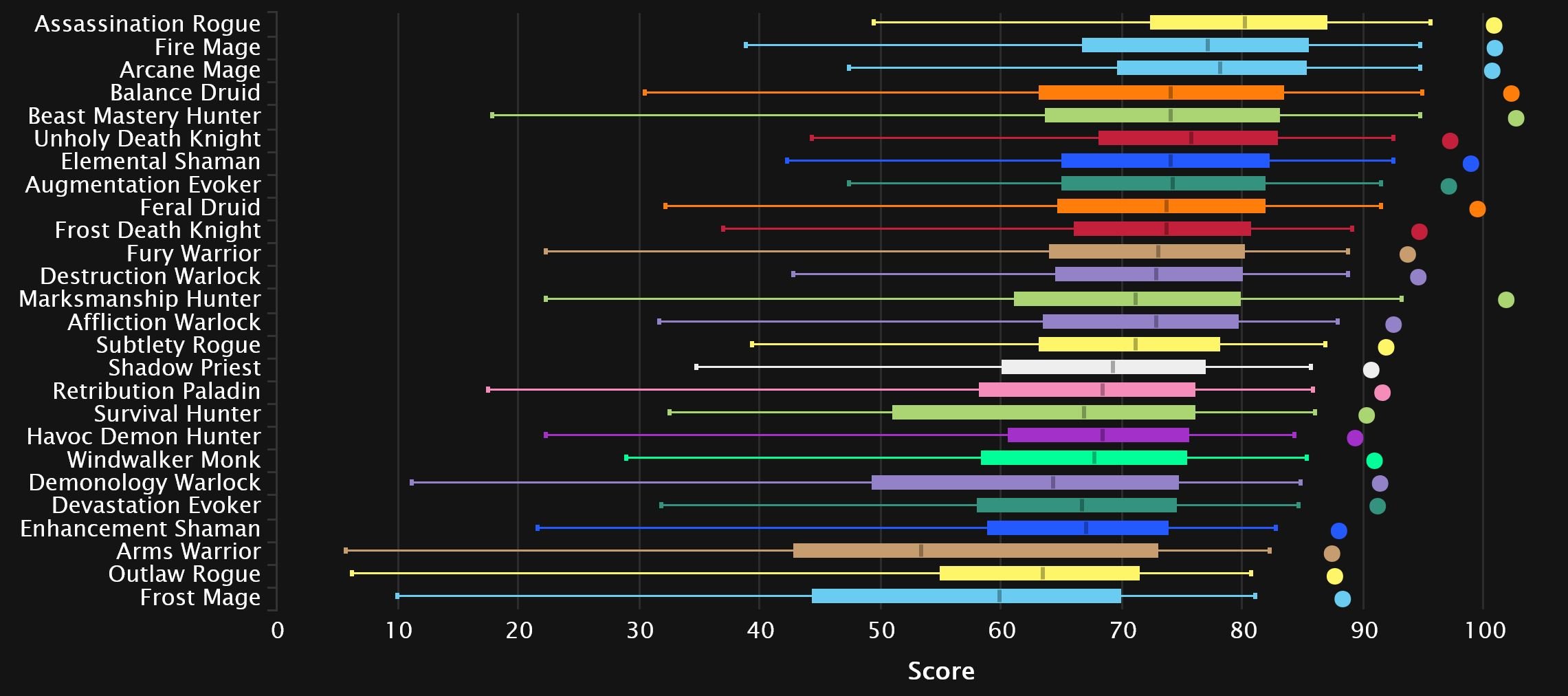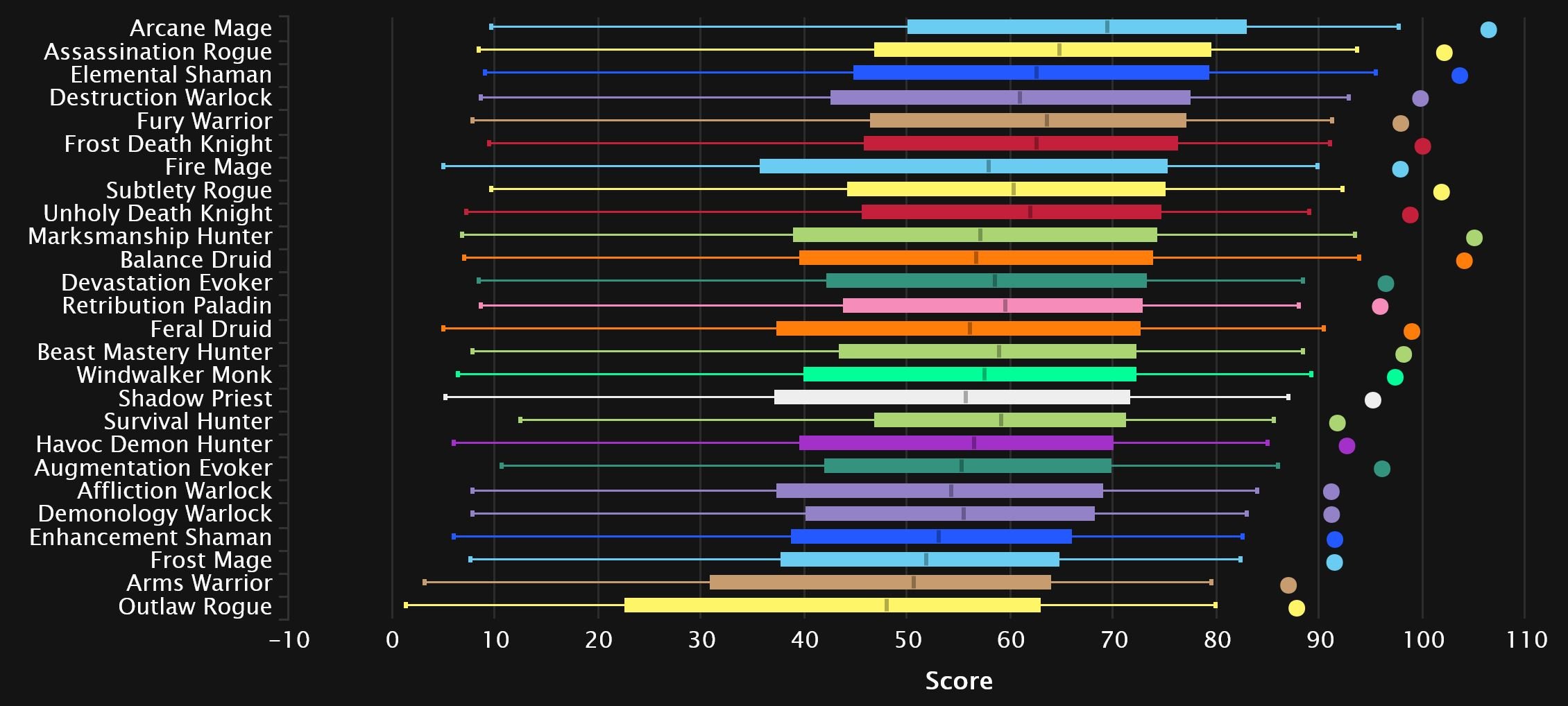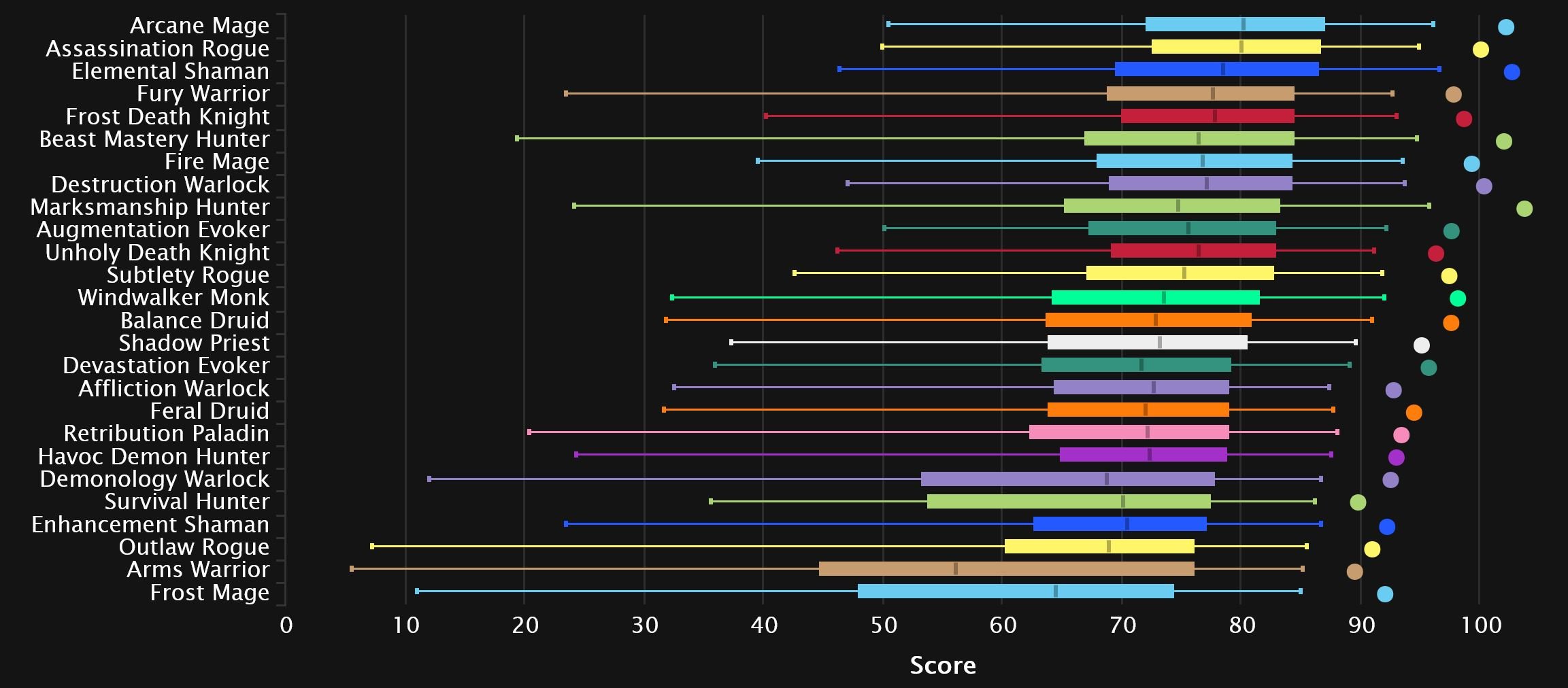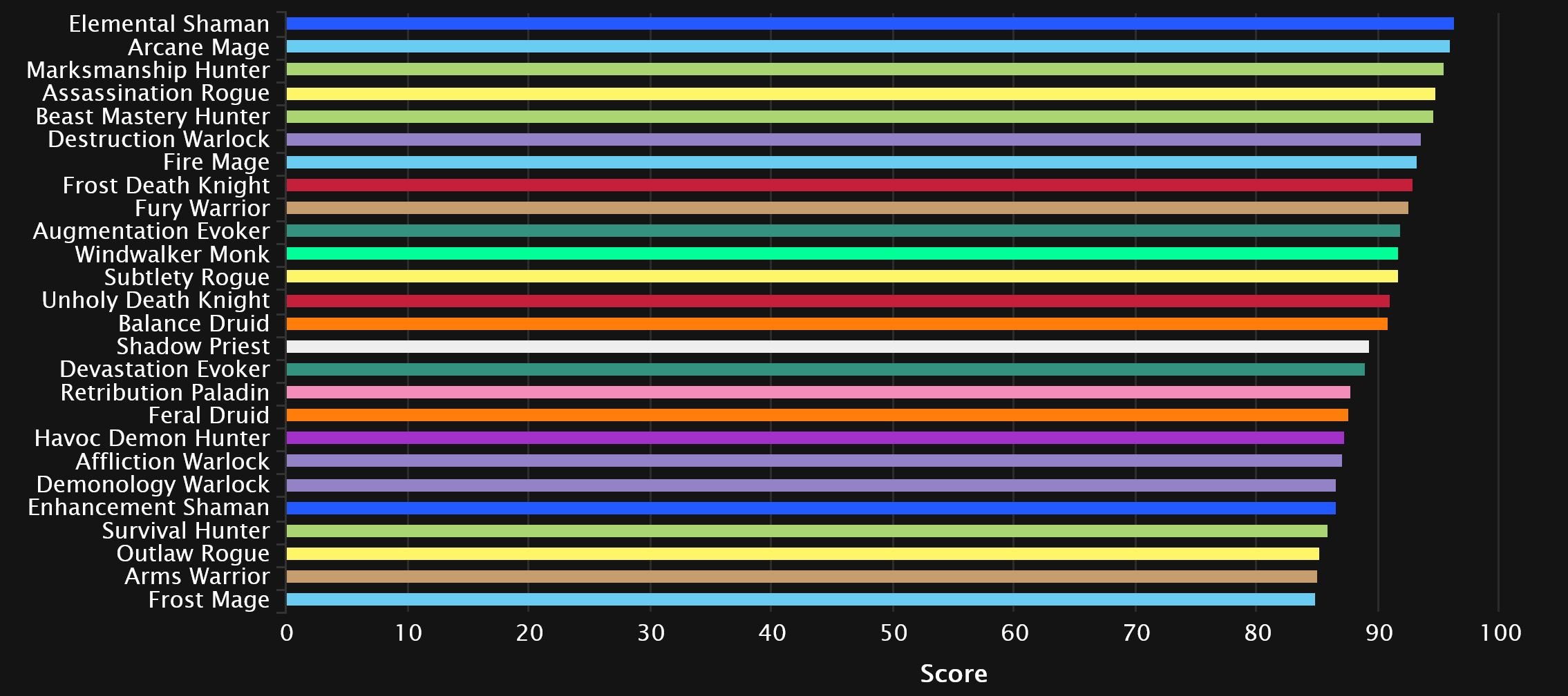 Note: We are using normalized scores instead of raw DPS for the Warcraft Logs rankings. Normalized scores take into account the outlier boss fights where certain specs could stack massive DPS (due to the nature of the fight, whether it’s AoE spam or something else), which would then affect their overall score for the whole raid.