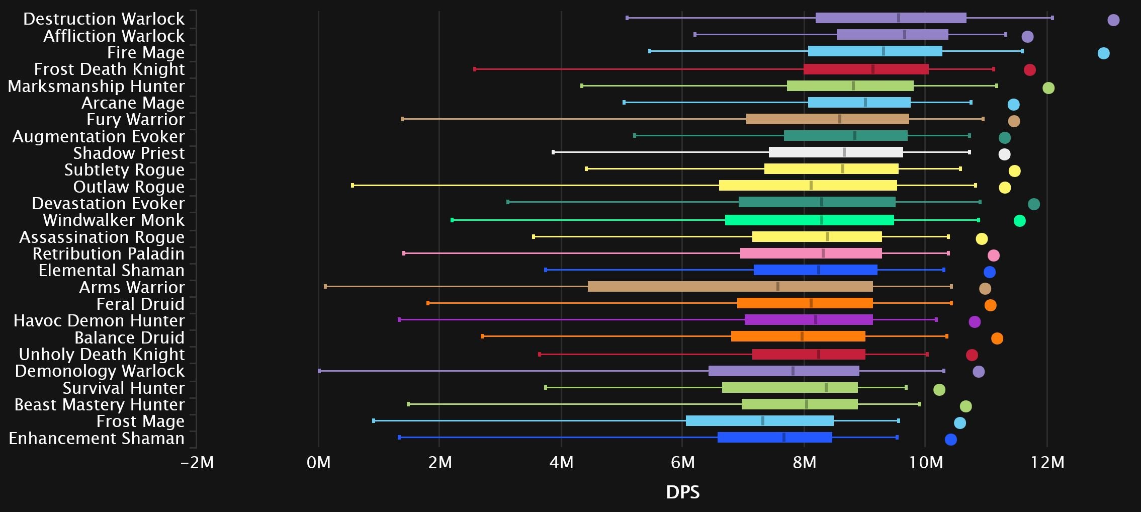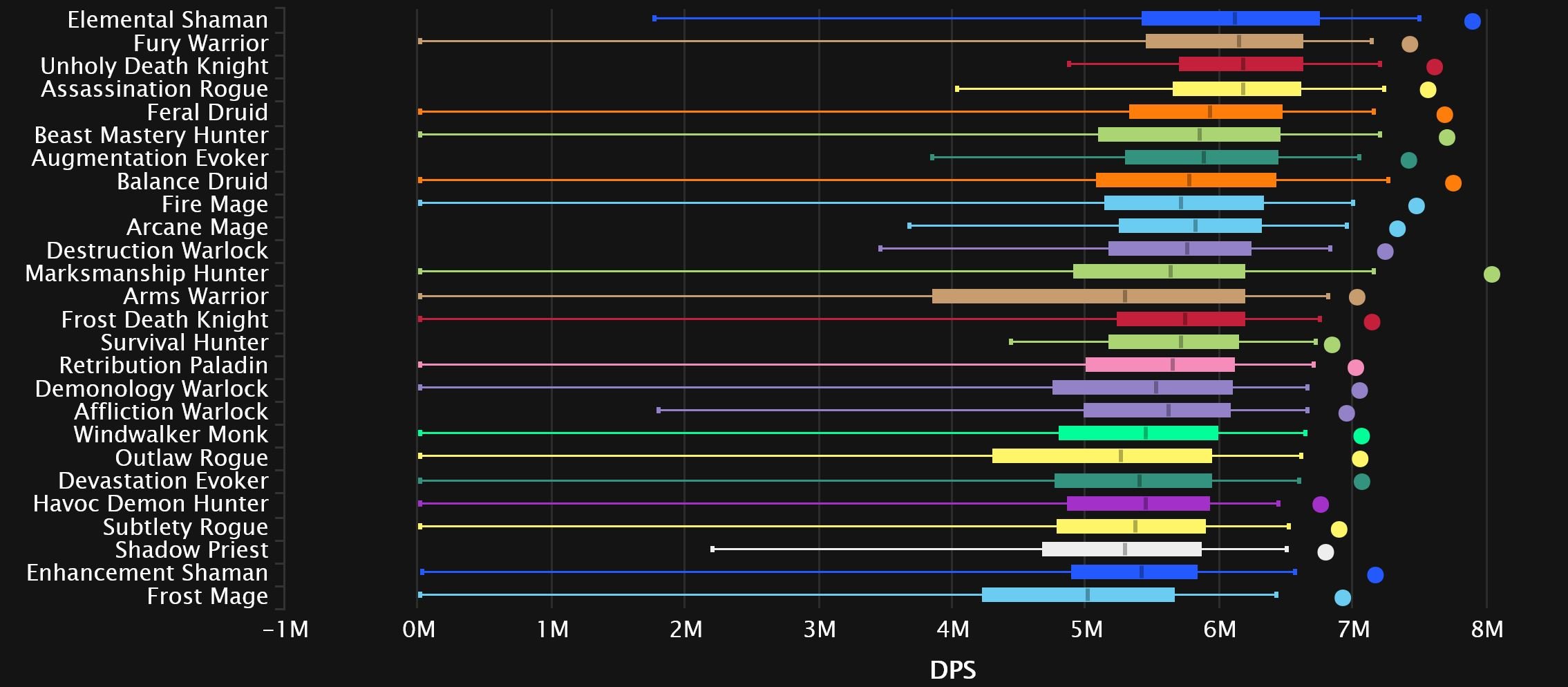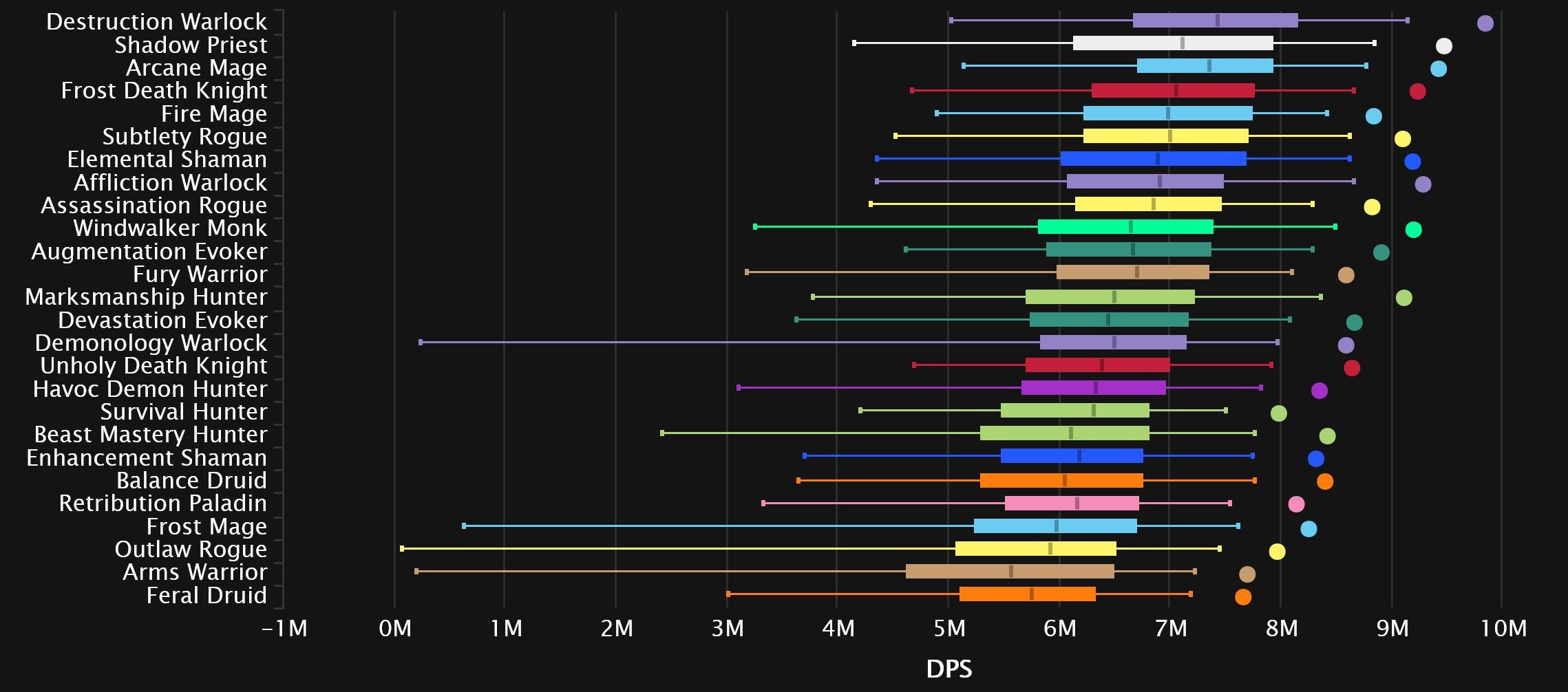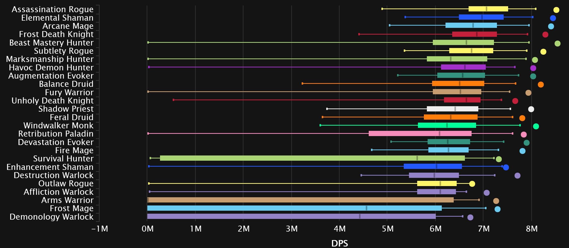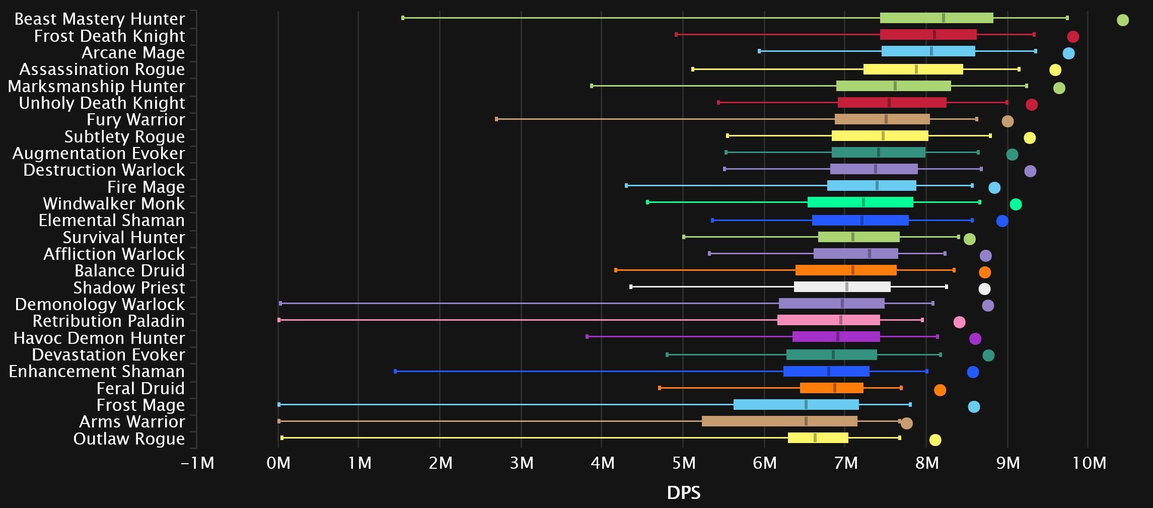 We still see movement in the upper reaches of the top percentiles, as the Hunters shuffle around again! Marksmanship is back in the top 3, with Beast Mastery dropping down to 5th in a big switcheroo. Assassination remains stable between the green specs, while Destruction moves one up just below BM. Frost DKs are having a bad week as both the Warlock and Fire move past it, dropping it down to 8th. Augmentation makes a move and enters the top 10, as Subtlety drops two spots. Down at the bottom, we see Arms and Survival playing their little game, as it’s the Warrior’s turn to drop into the bottom 3 this week.
