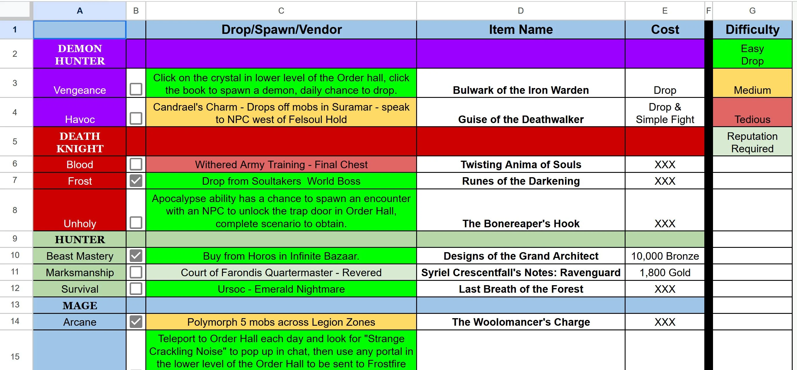 We already covered two very handy guides for all the hidden appearances, but you’ll only need one for each class. There’s the video guides, which will be less useful if you’re just rushing to the easiest one. And then there’s the true champion, ValthaneKarnex spreadsheet! You can clearly see which are easy to get, and most importantly, you can see which ones you can buy directly from Horos above!