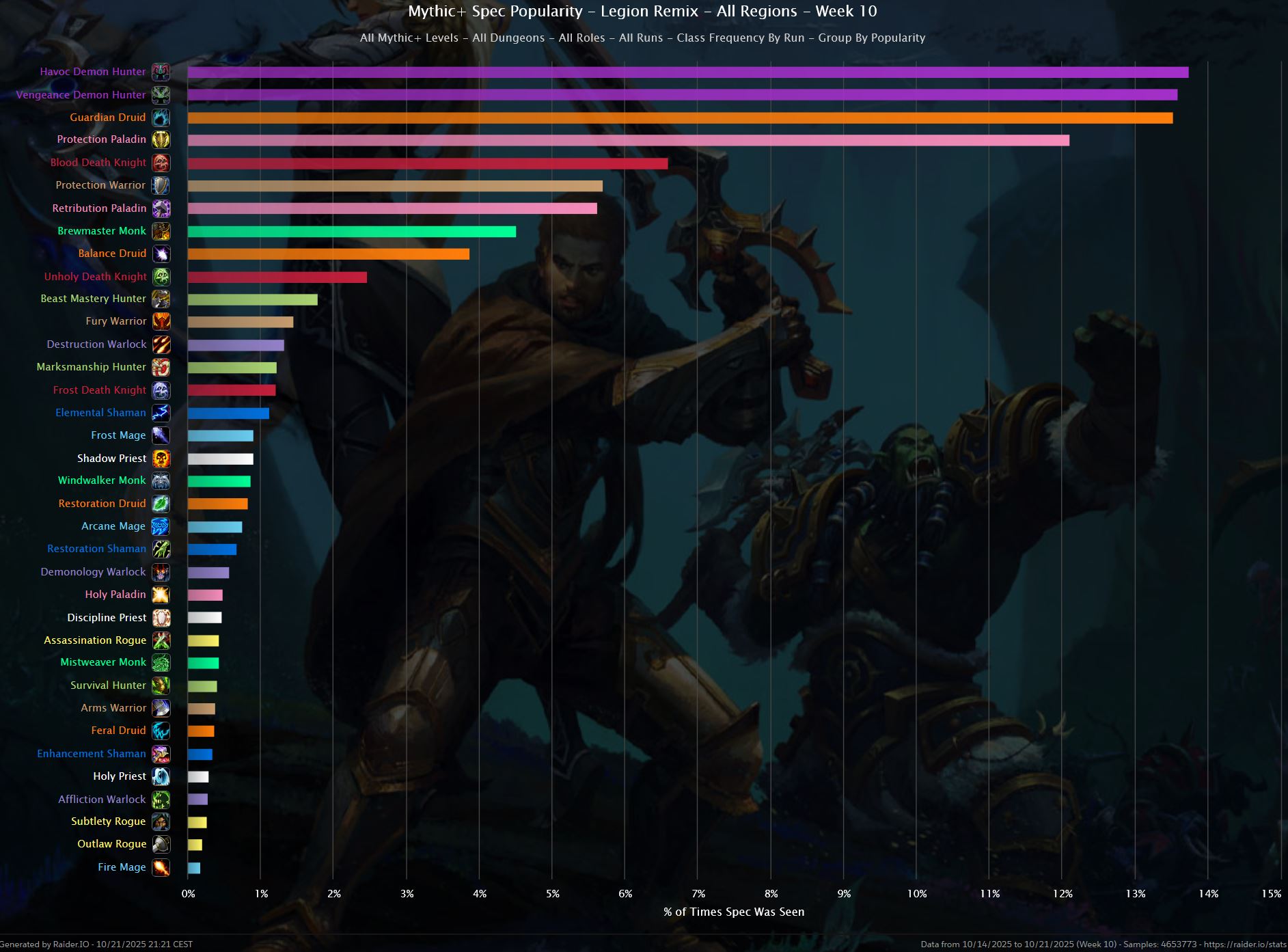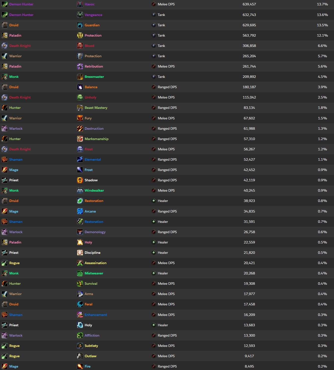 The Demon Hunters are dominating and then some, with the DPS one getting the better of the tank, mostly based on solo runs. Guardian is next up and very close to the top 2, as all three hover around 13% of the total runs, while the only other spec even remotely competing with it is Prot Paladin, and it’s a bit lower, down at 12%. The next 4 specs are each less than half of the top 4, coming in at 4-6%, and after that it’s a freefall with no spec breaking 2%, and getting below 1% after No.17.