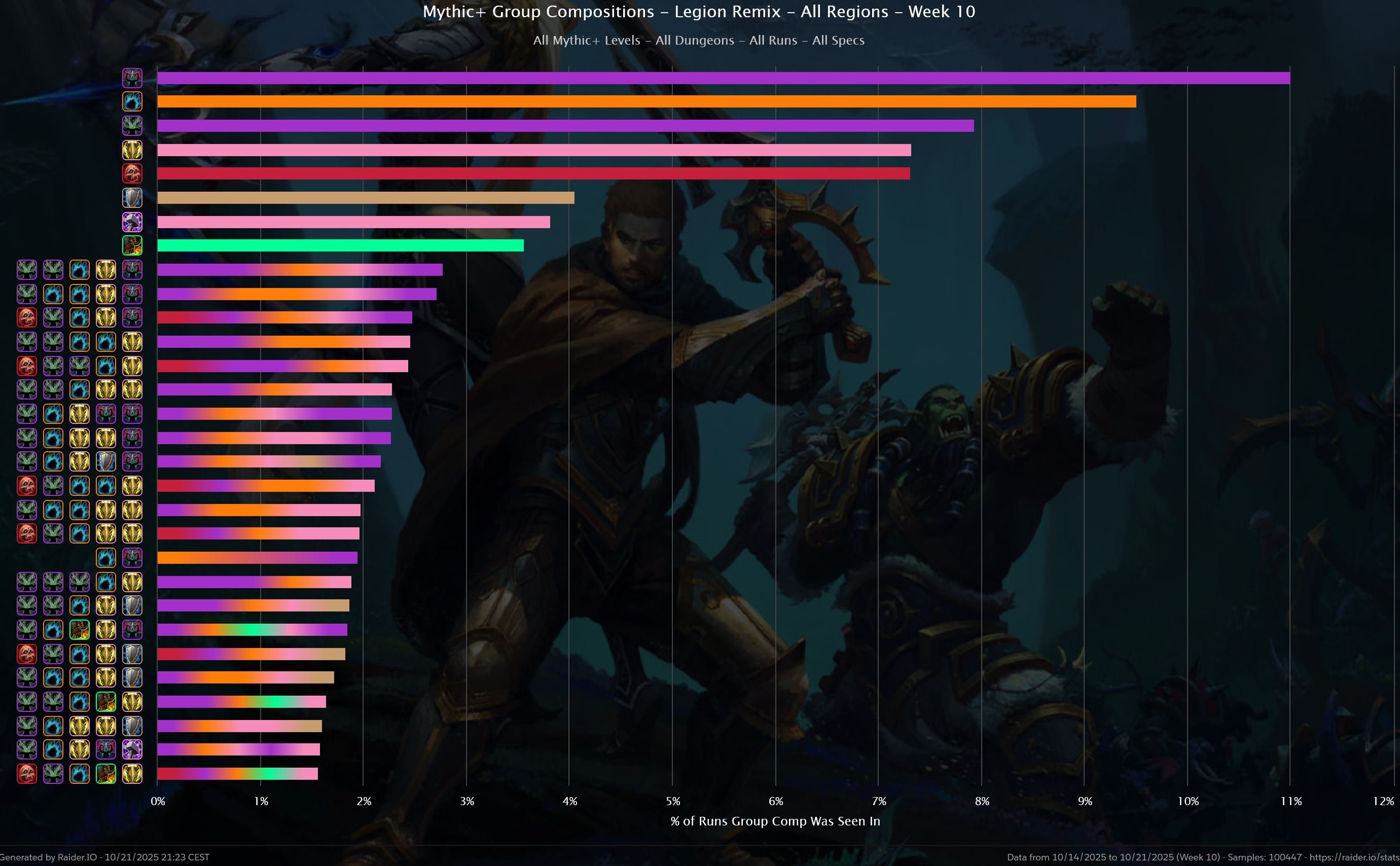 Remix is in full swing, with Phase 2 this week. So it’s time to check out what’s being played in the dungeons! We’ve already seen the insane highs players are getting to, with +113s completed. But what’s the majority of players playing as? The numbers are VERY different from the usual charts, and not only in terms of which specs are on top, as the group popularity chart in particular is looking pretty crazy. Let’s dive in.