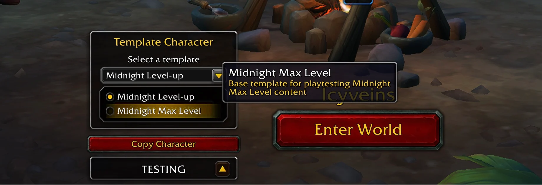 Now you can simply log in to the Beta on any level-up realm and in the Template Character menu now has a new dropdown option that says Midnight Max Level.