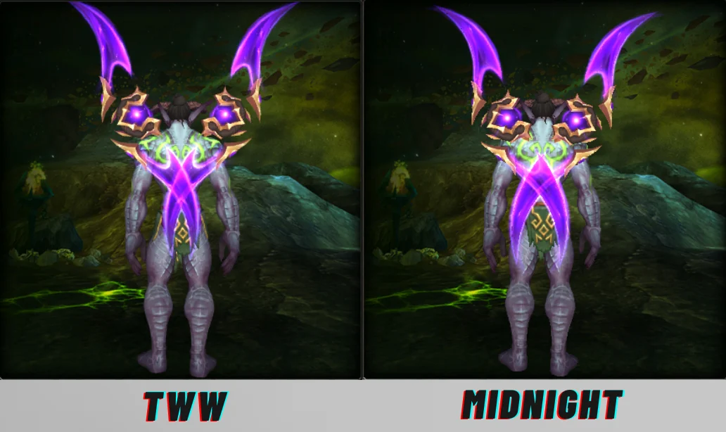 In Midnight, the warglaives are pulled in closer, and sit lower on the character’s back, with less of the handle visible.