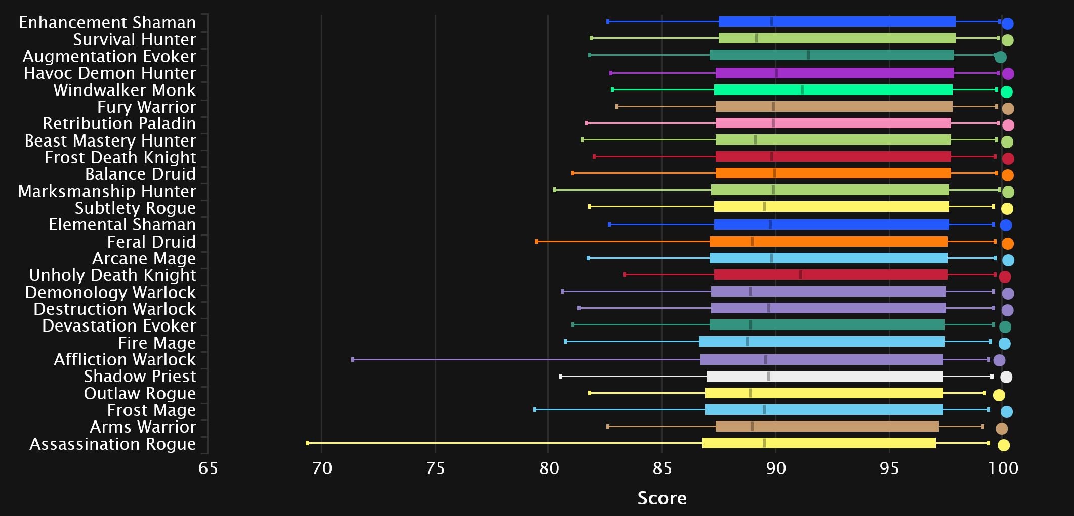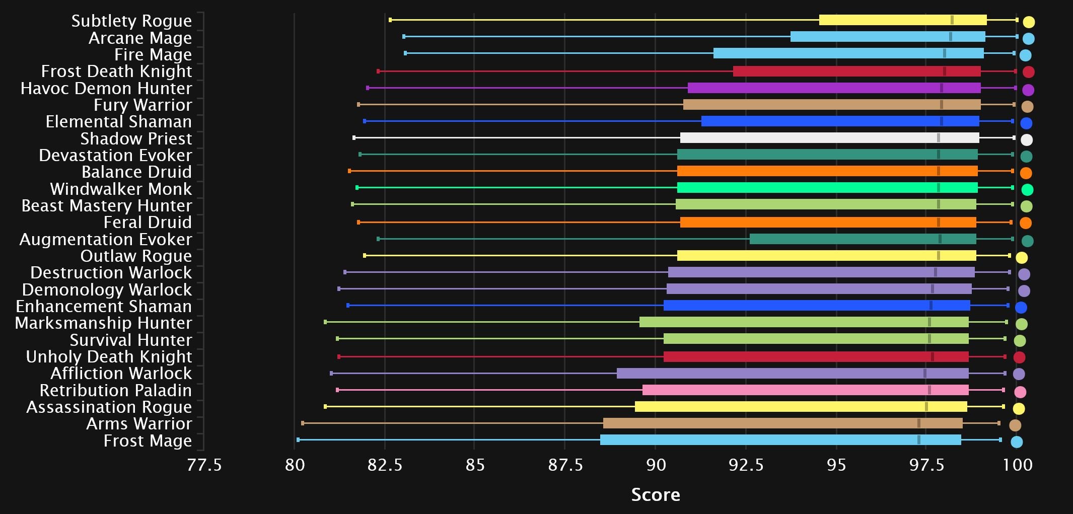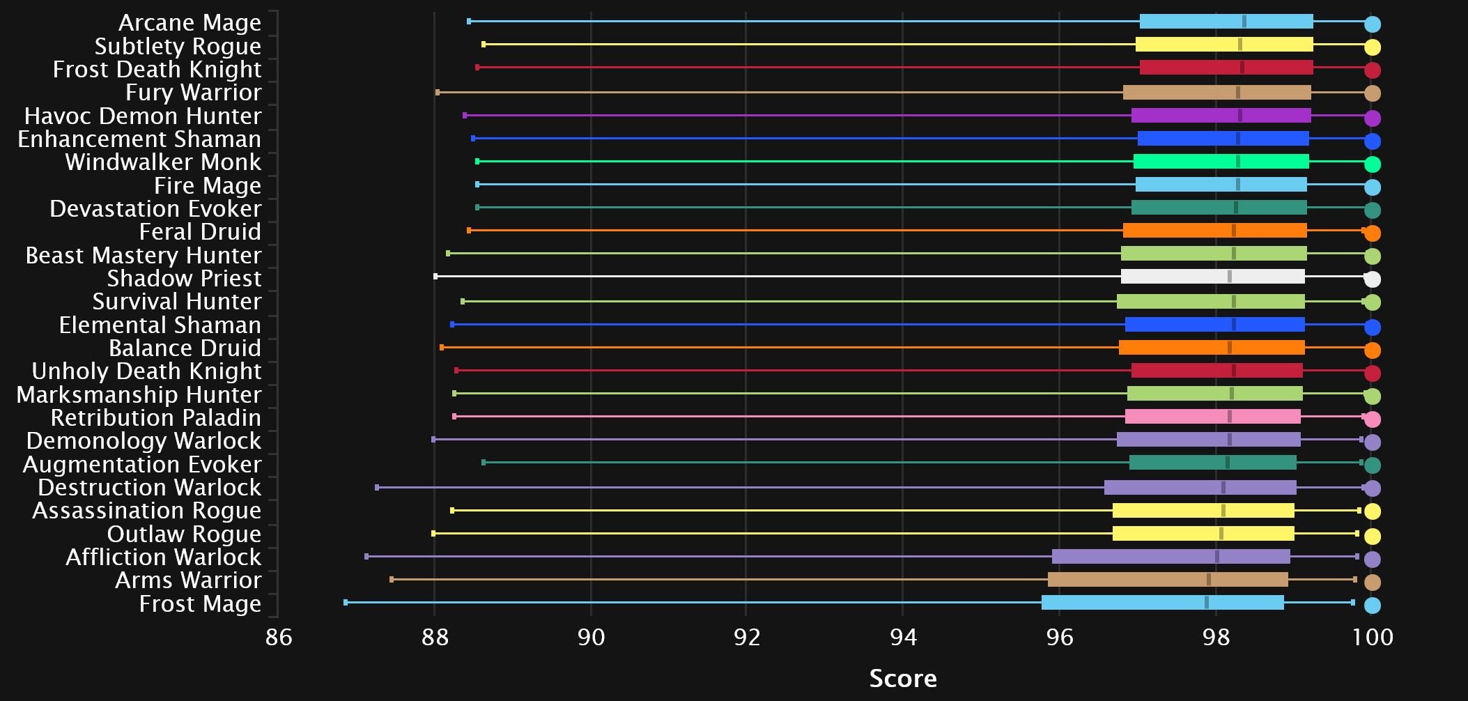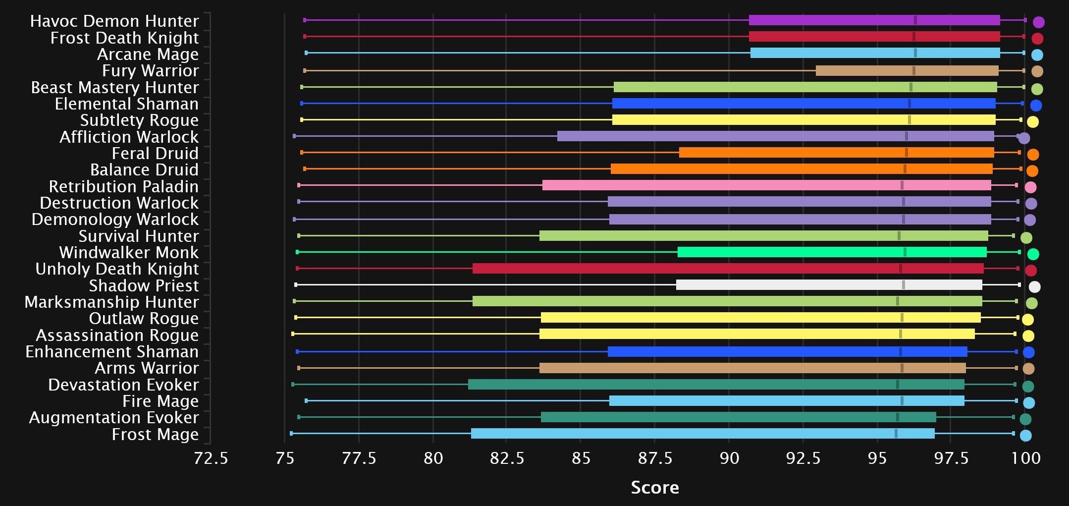 The tuning is only starting to show at the top, as Frost DK retains its dominance in the high percentiles. We do see Arcane drop below Havoc post-nerf, however, as well as Beast Mastery lose a spot. Elemental is the big climber, same as in the raid, grabbing two spots, as both Fury and Subtlety drop. Feral and Outlaw remain stable near the end of the top 10, with Unholy moving past Balance to grab the final spot. The bottom 3 remain the same, as the tuning only brought nerfs for the top classes, but Arms did manage to push to the top of the bottom, past Augmentation.