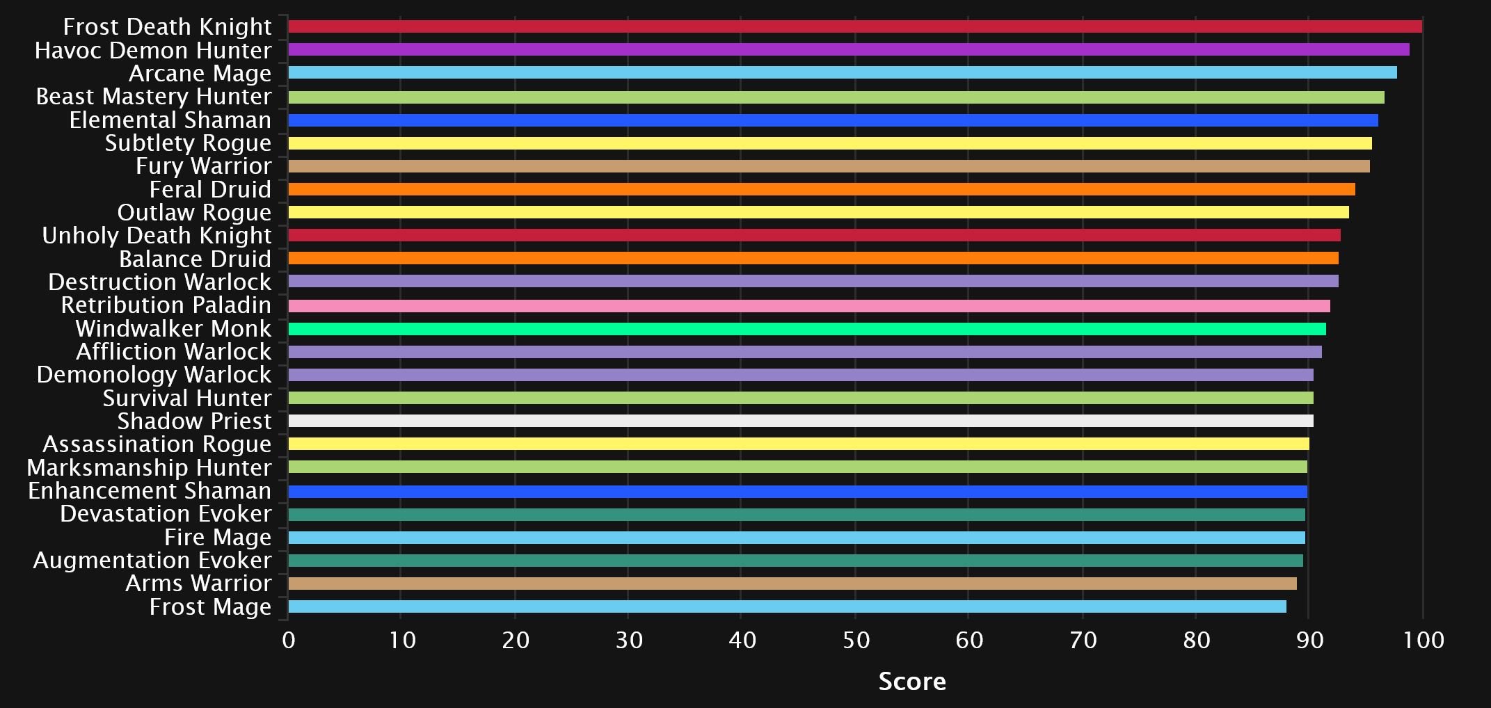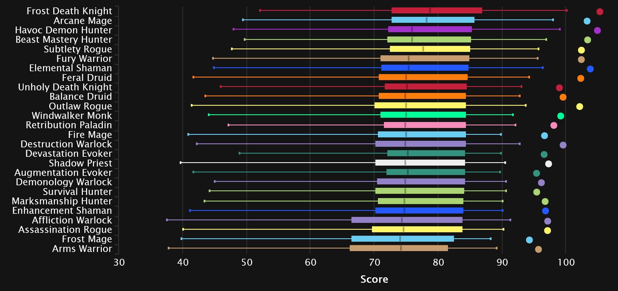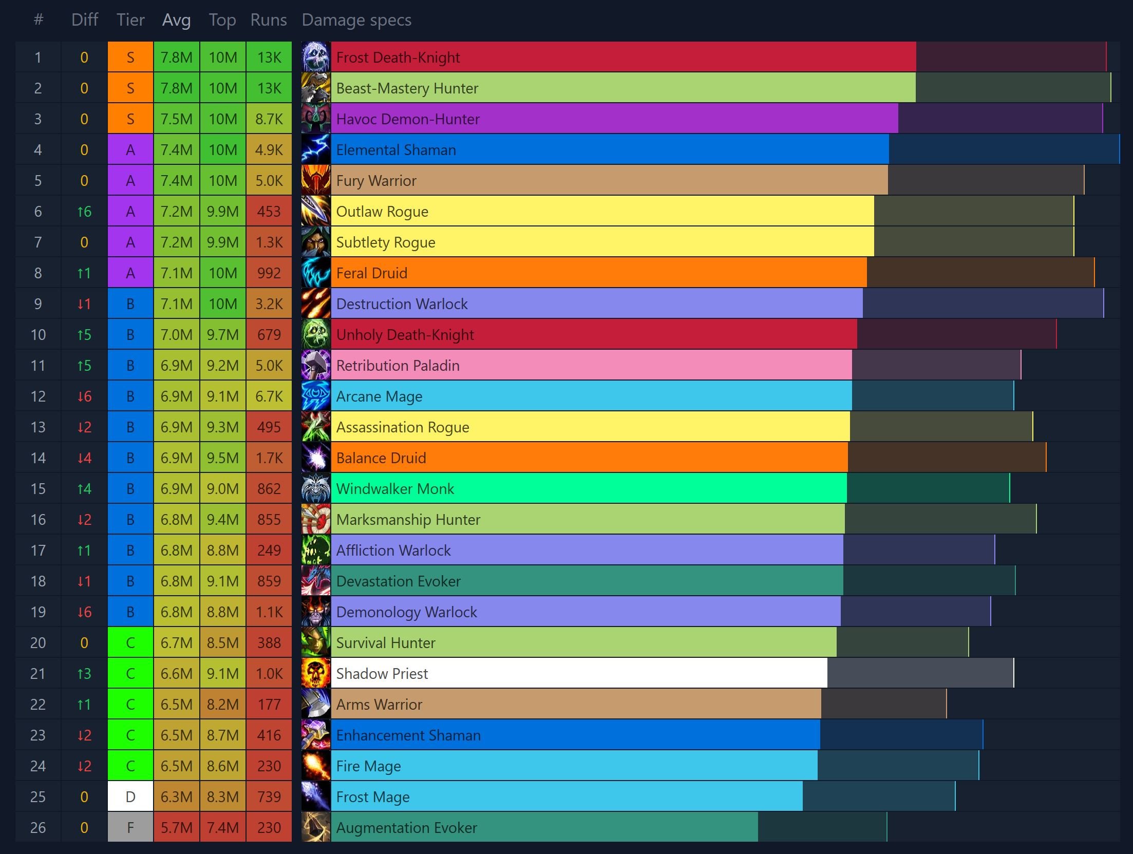 The tuning is only starting to show at the top, as Frost DK retains its dominance in the high percentiles. We do see Arcane drop below Havoc post-nerf, however, as well as Beast Mastery lose a spot. Elemental is the big climber, same as in the raid, grabbing two spots, as both Fury and Subtlety drop. Feral and Outlaw remain stable near the end of the top 10, with Unholy moving past Balance to grab the final spot. The bottom 3 remain the same, as the tuning only brought nerfs for the top classes, but Arms did manage to push to the top of the bottom, past Augmentation.