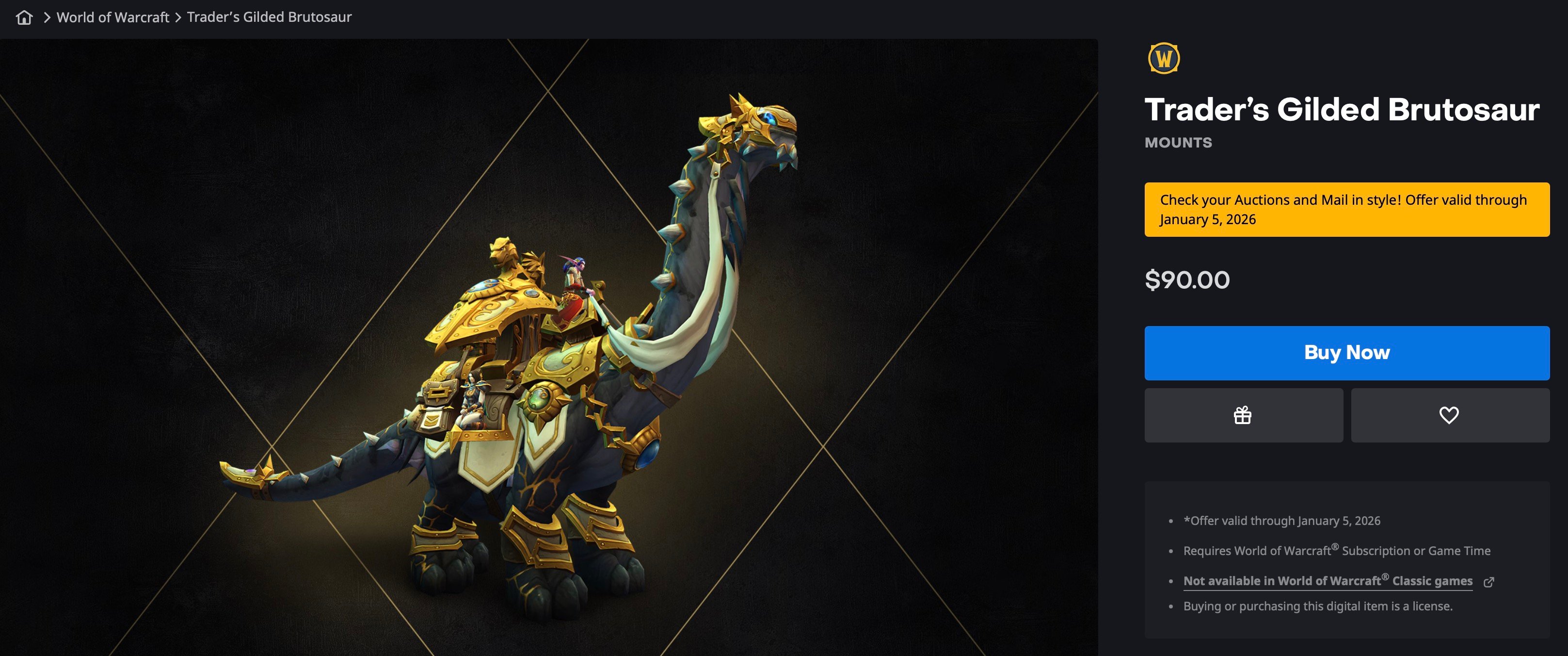 Reins of the Trader’s Gilded Brutosaur has returned to the shop for WoW’s 21st anniversary event.