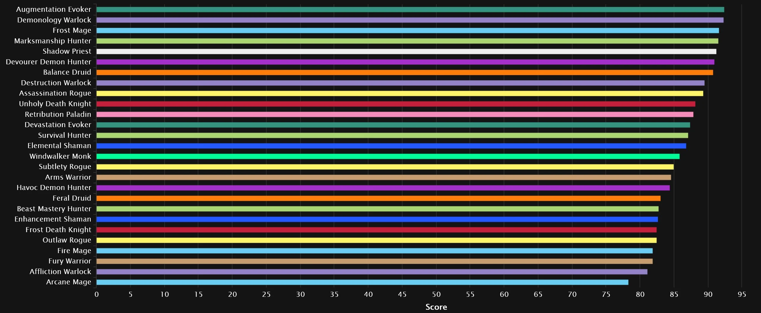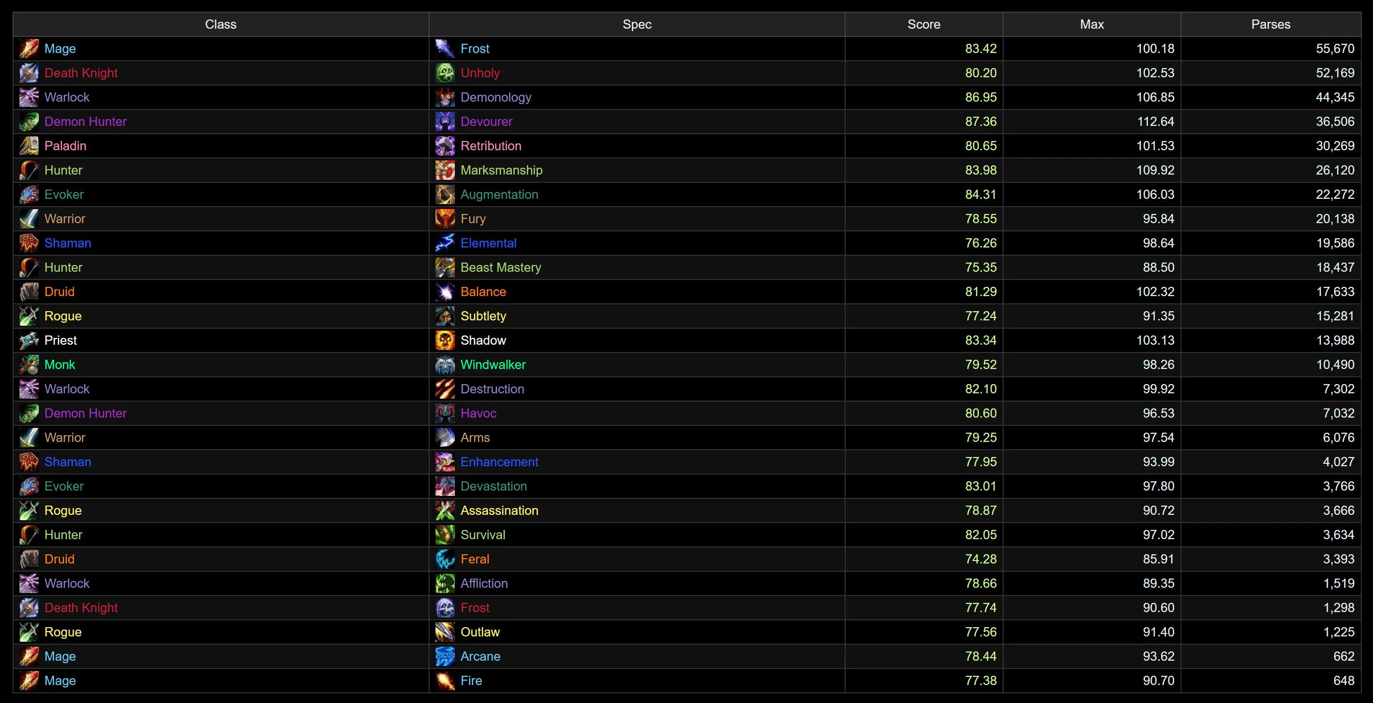 Note: We are using normalized scores instead of raw DPS for the Warcraft Logs rankings. Normalized scores take into account the outlier boss fights where certain specs could stack massive DPS (due to the nature of the fight, whether it’s AoE spam or something else), which would then affect their overall score for the whole raid.