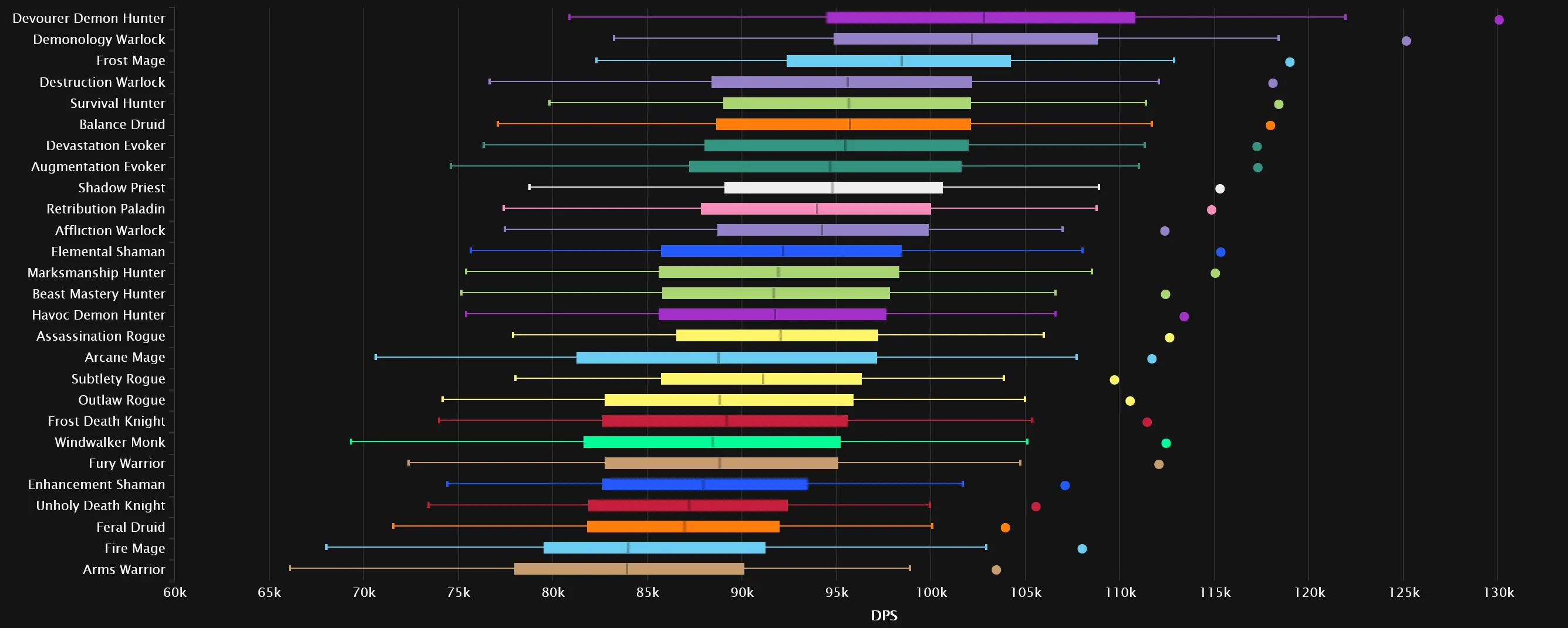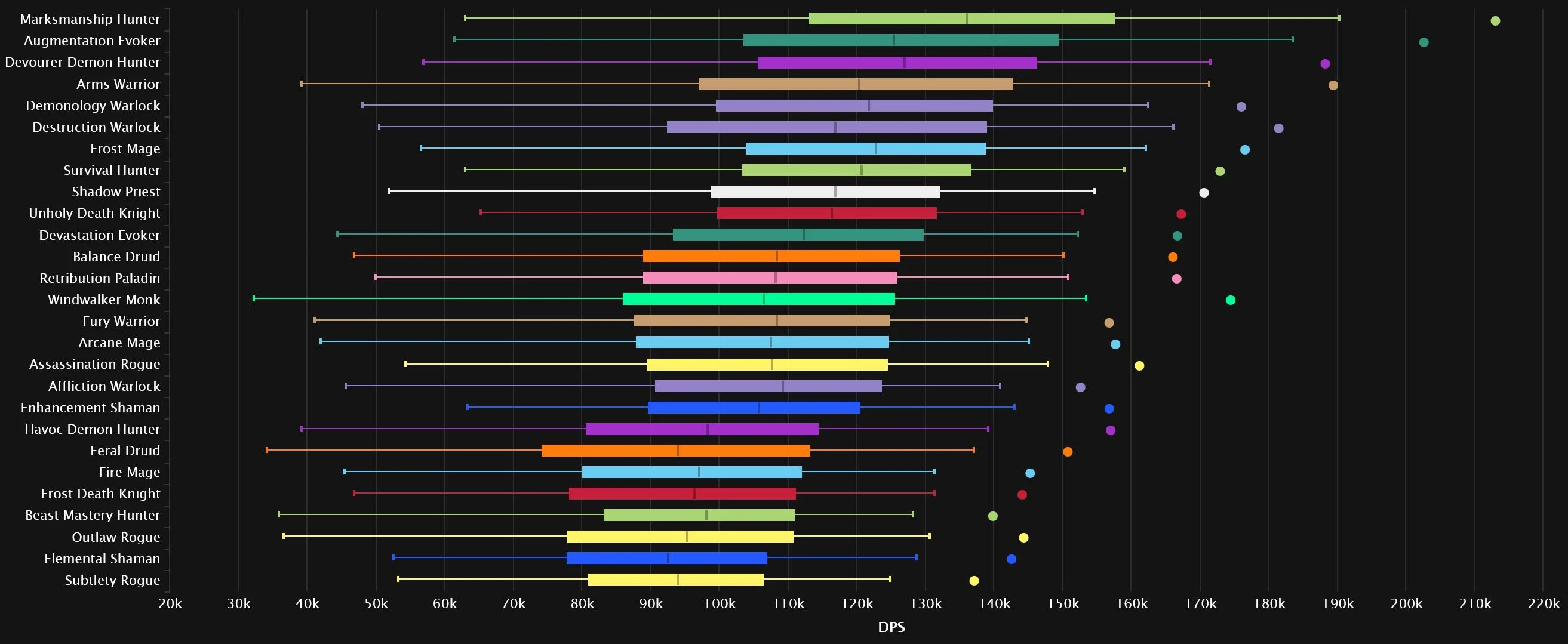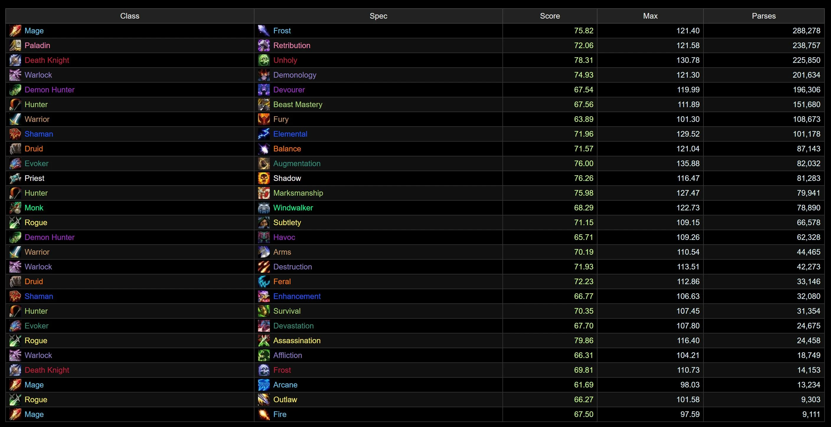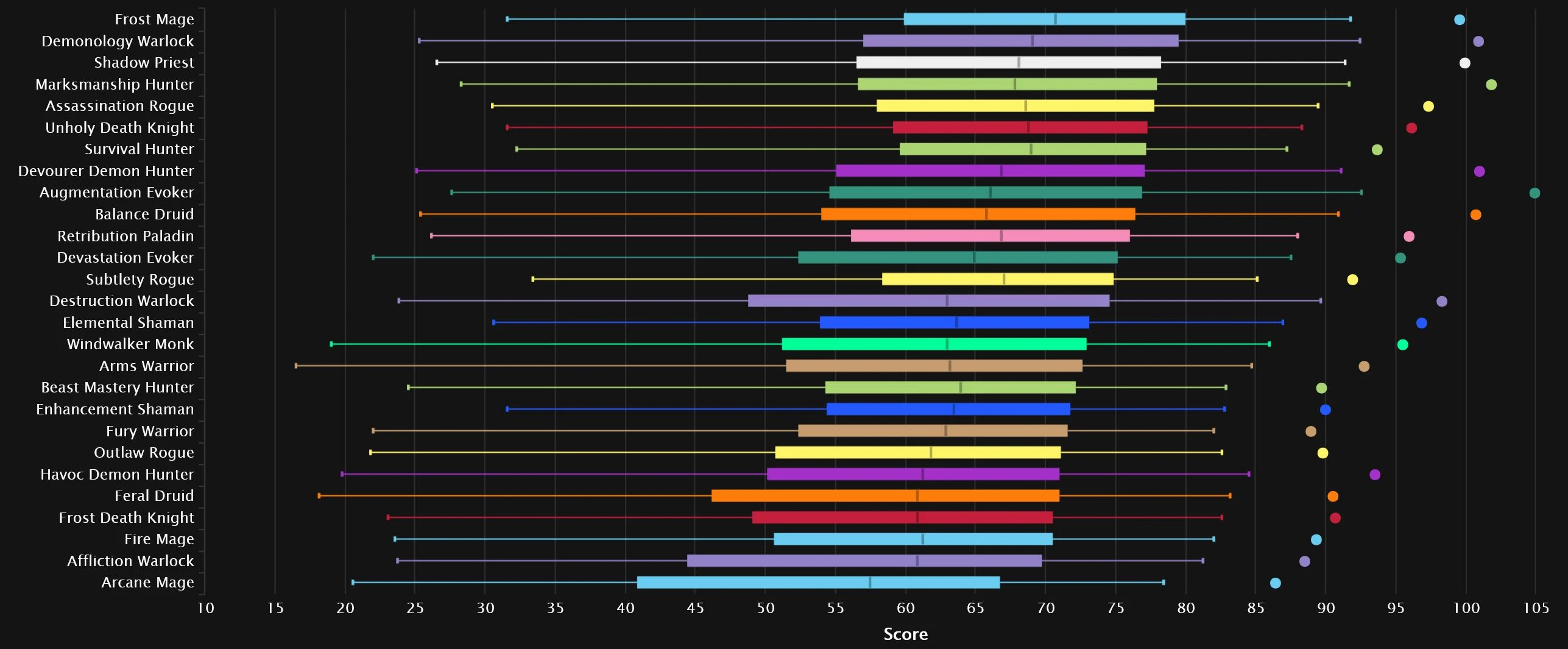 Shadow manages to defend its No.3 spot here, but Marksmanship is still surging, moving past Assassination and Survival into 4th. Unholy is moving up a lot here, grabbing 3 spots in 6th. Augmentation drops a couple of spots, as it seems to be more of a top player spec, with the lower percentiles dropping despite it leading the pack in the top ones. We still have two mages in the bottom 3, so hopefully they feel better about Frost being on top.