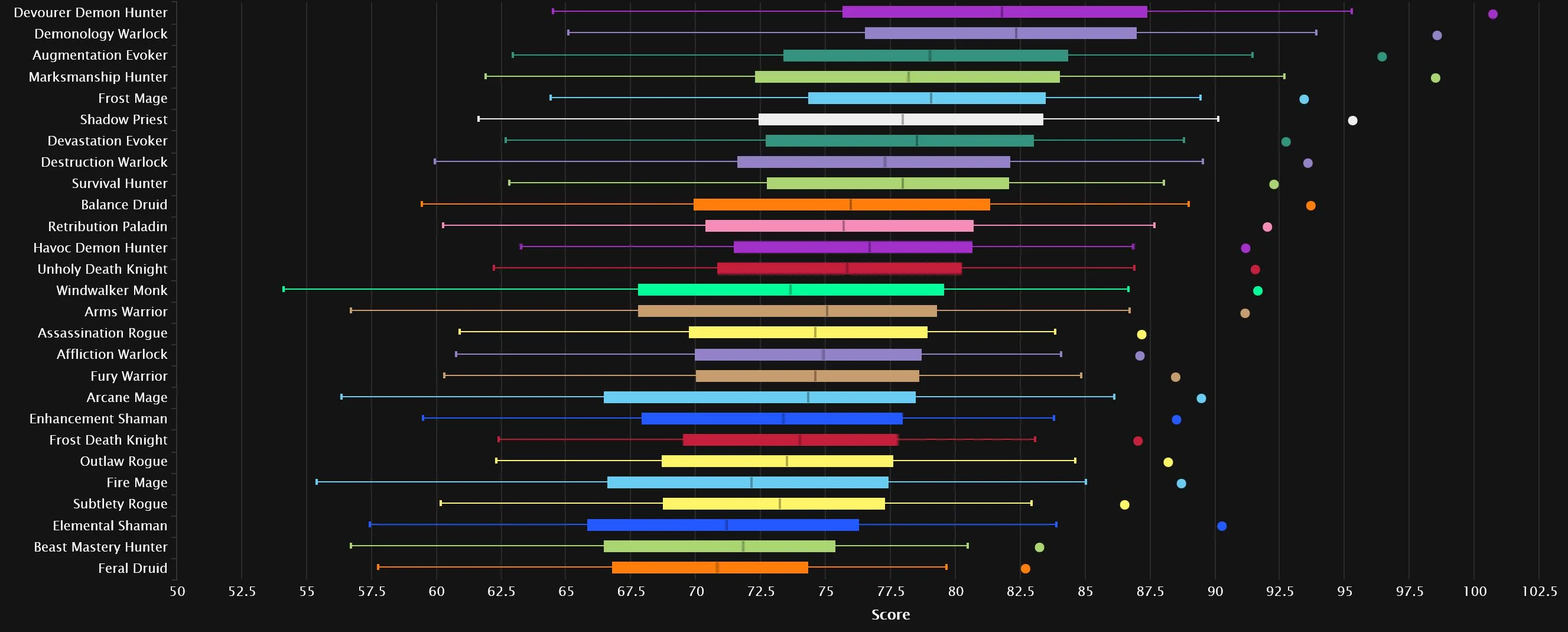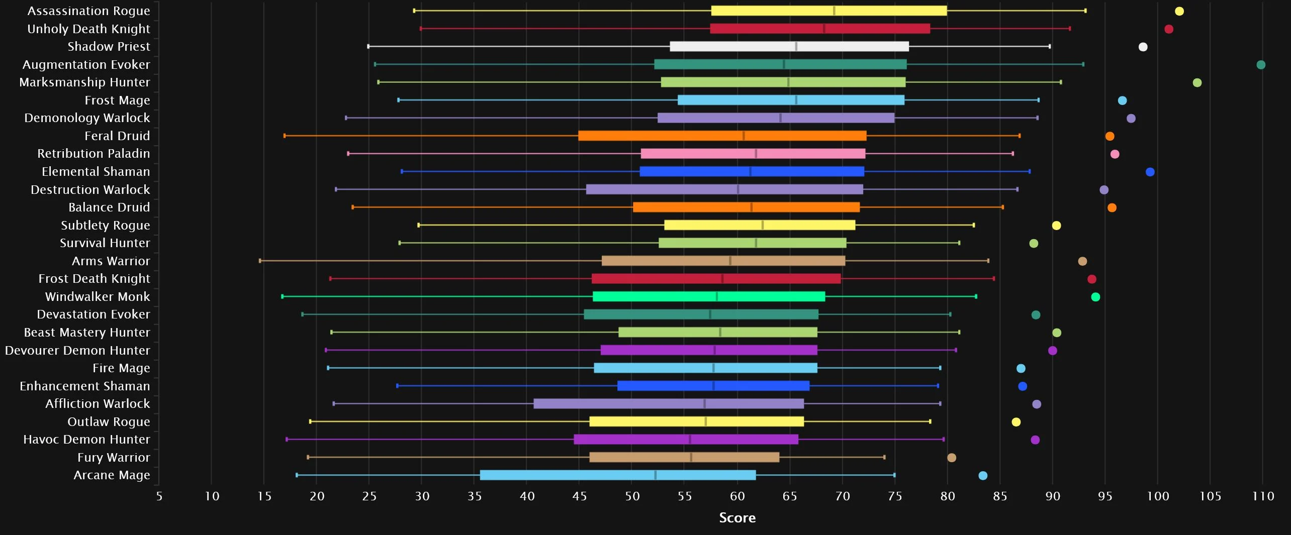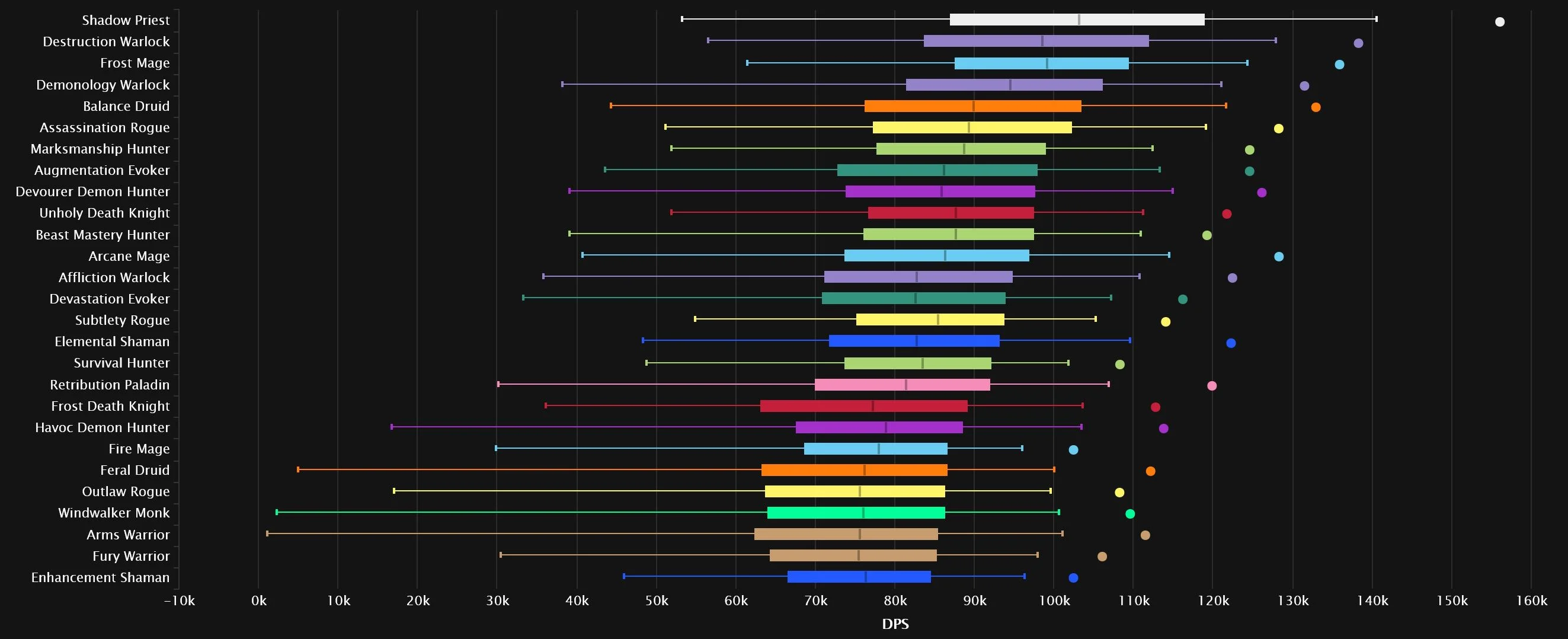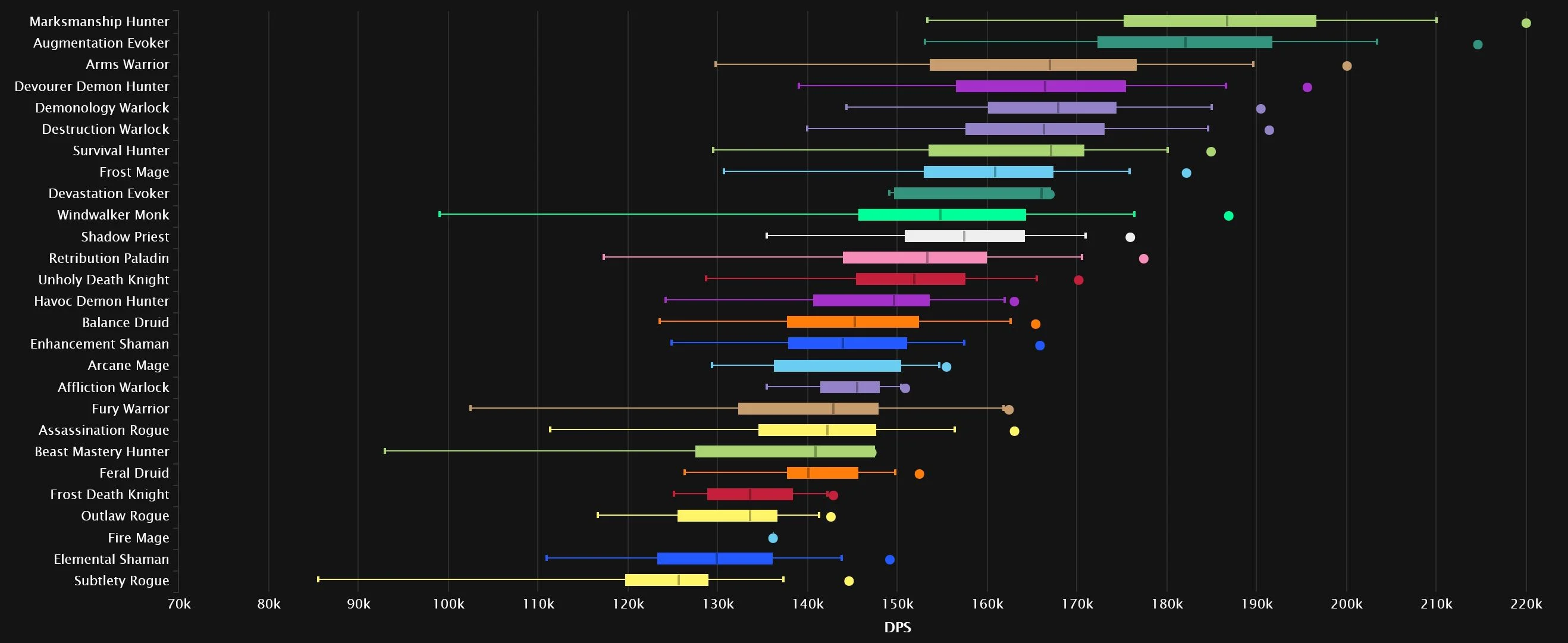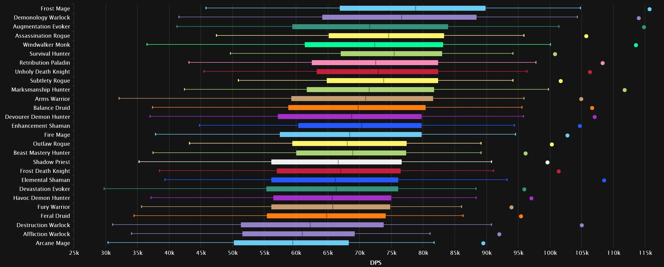 Shadow manages to defend its No.3 spot here, but Marksmanship is still surging, moving past Assassination and Survival into 4th. Unholy is moving up a lot here, grabbing 3 spots in 6th. Augmentation drops a couple of spots, as it seems to be more of a top player spec, with the lower percentiles dropping despite it leading the pack in the top ones. We still have two mages in the bottom 3, so hopefully they feel better about Frost being on top.