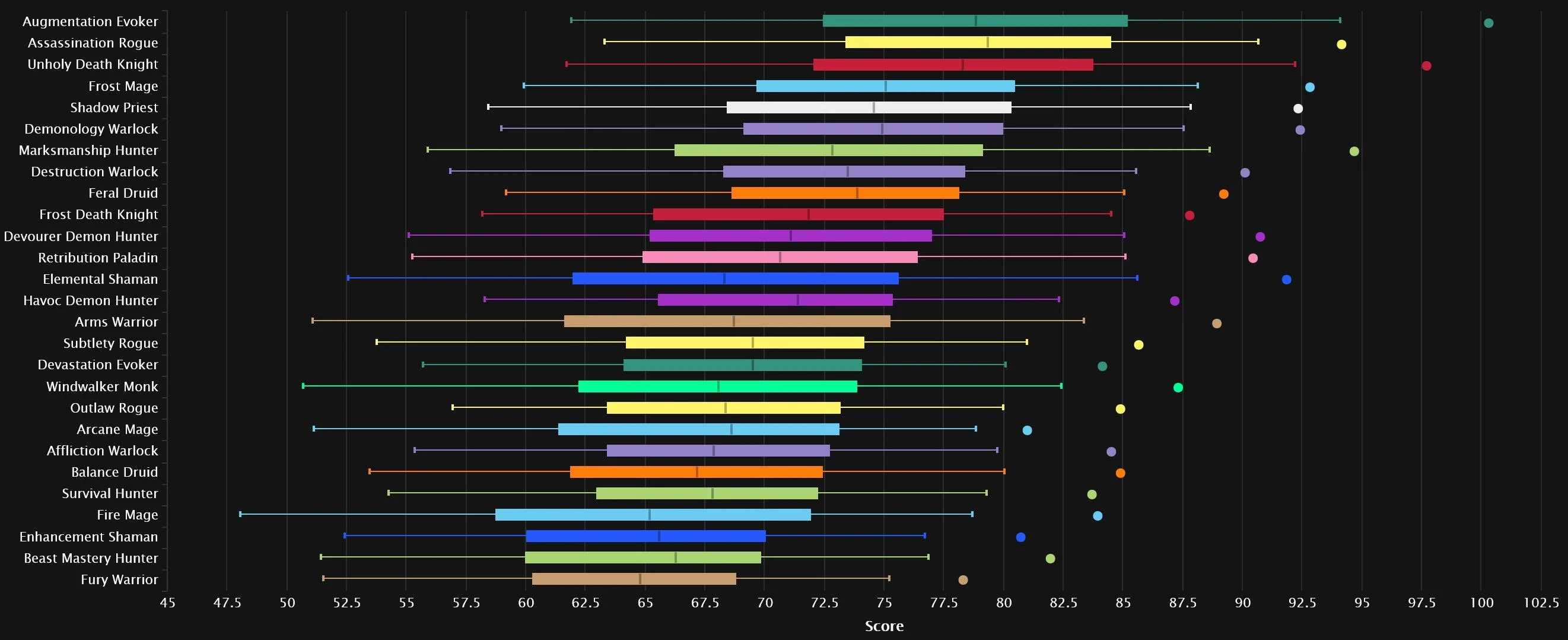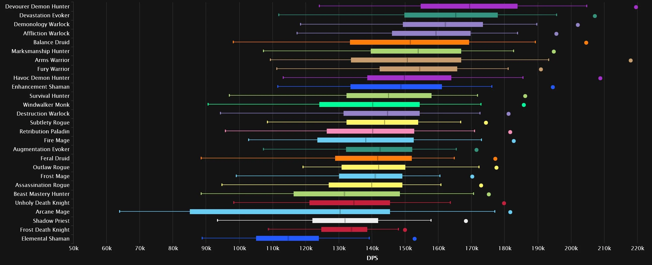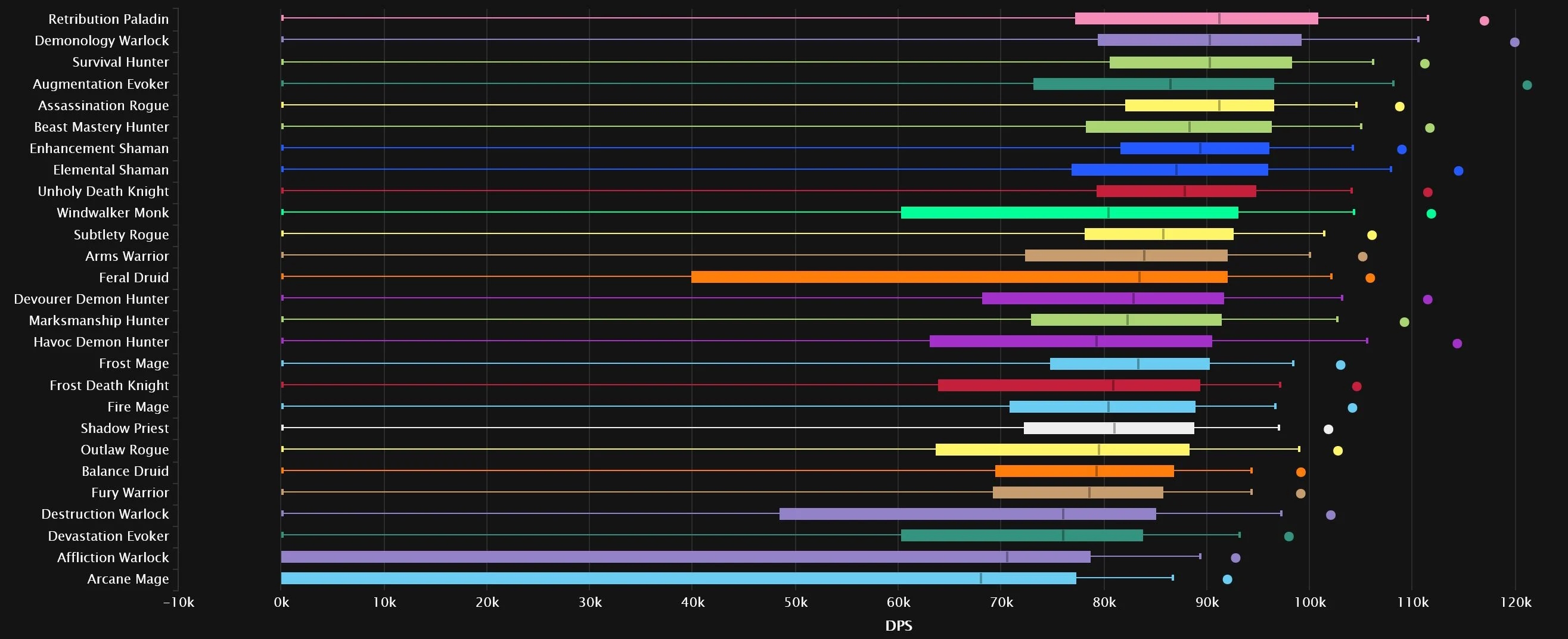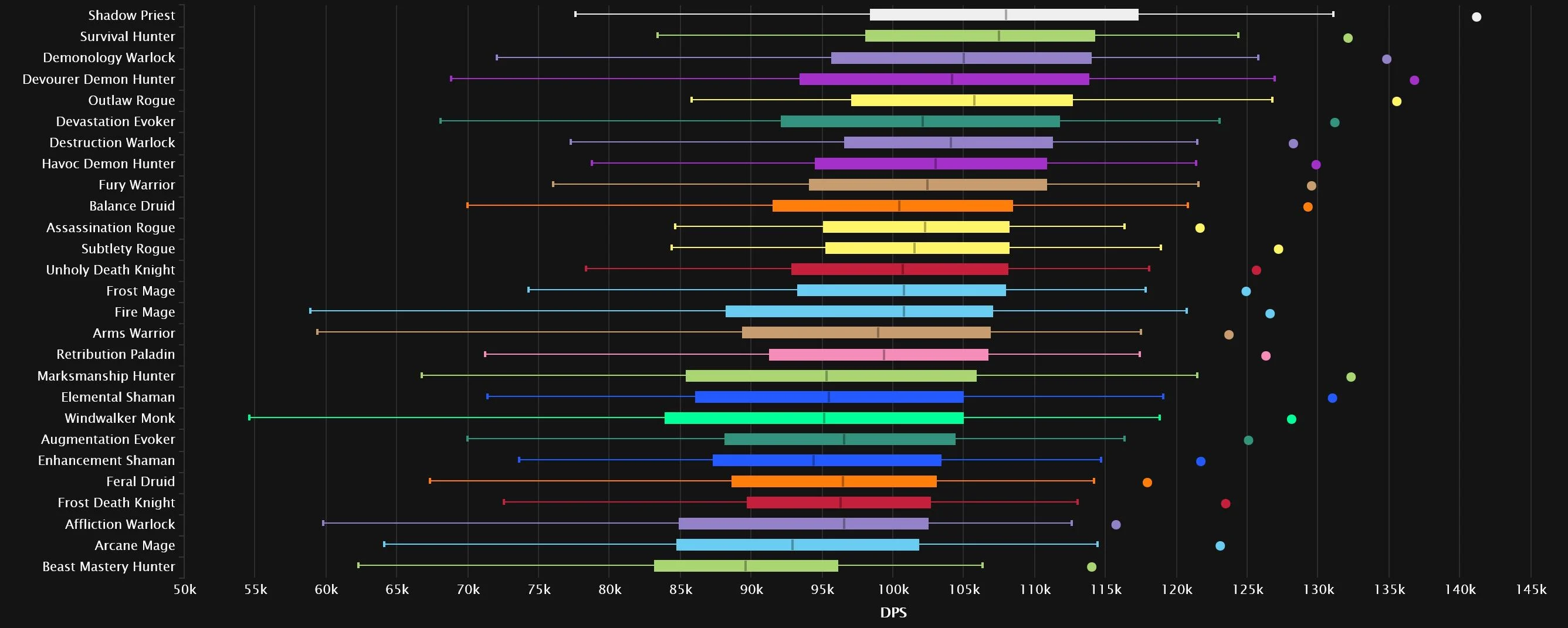 Shadow manages to defend its No.3 spot here, but Marksmanship is still surging, moving past Assassination and Survival into 4th. Unholy is moving up a lot here, grabbing 3 spots in 6th. Augmentation drops a couple of spots, as it seems to be more of a top player spec, with the lower percentiles dropping despite it leading the pack in the top ones. We still have two mages in the bottom 3, so hopefully they feel better about Frost being on top.