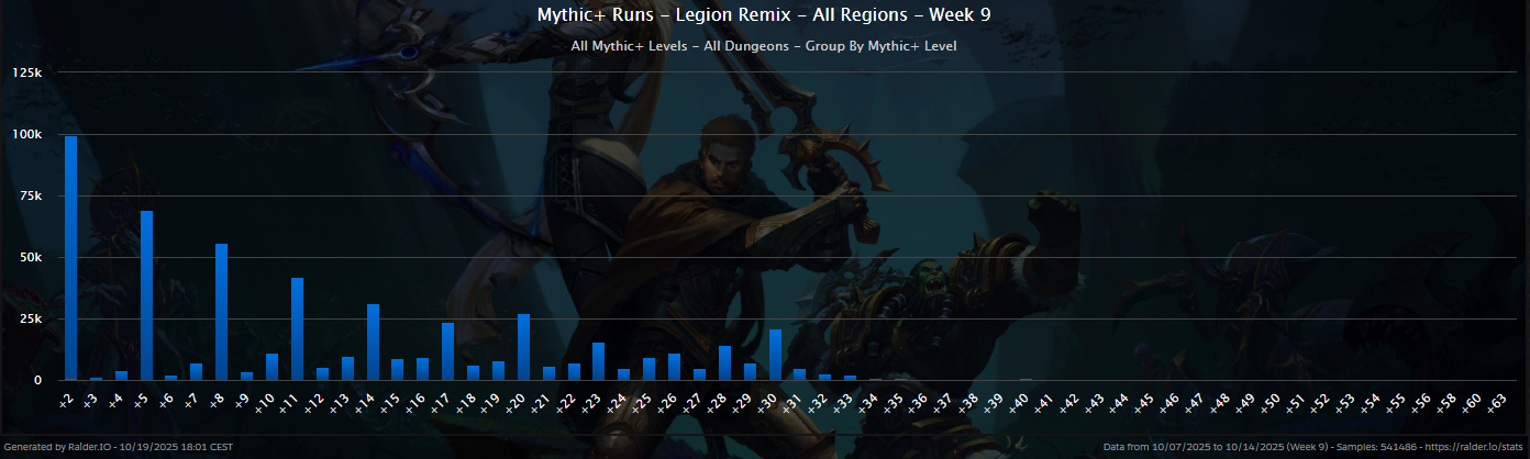 The ninth week of Mythic+ in this season is over, and Nightstalker314 is taking a look at the weekly data provided by Raider.IO. With the release of Legion Remix, most interest has shifted over to it. In addition, its version of M+ with wild scaling and seemingly endless progression is also seeing strong participation. While the focus in TWW M+ continued to shift towards high keys, Remix M+ has only just started to take off with massive amounts of lower keys. So, let’s look at the details.