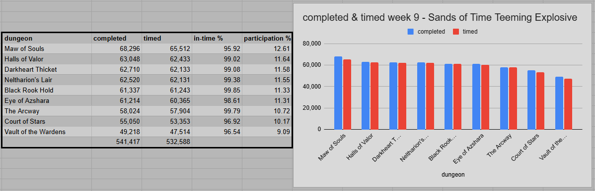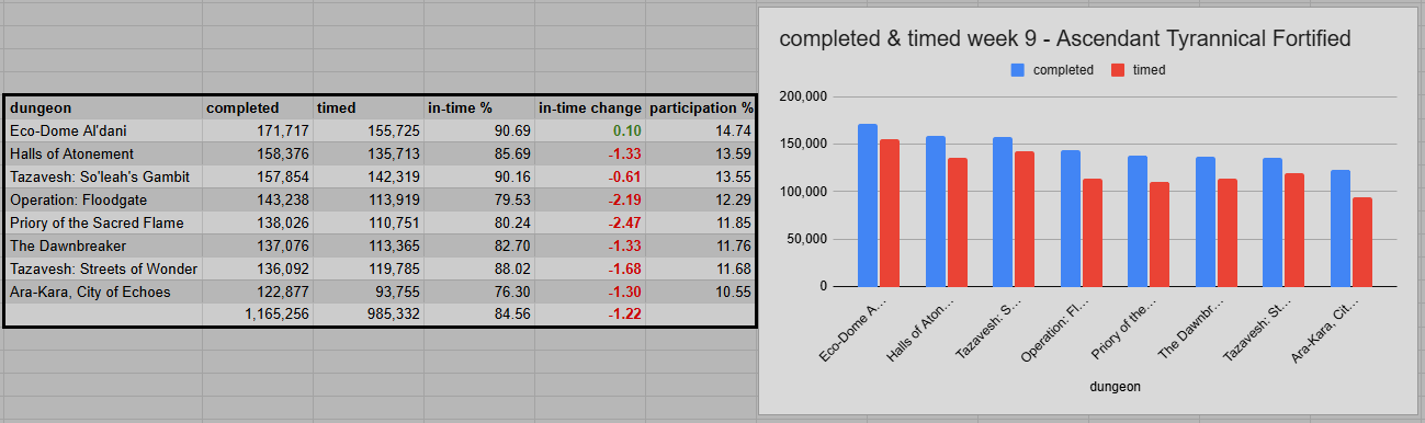 In terms of total numbers, Remix hadn’t reached the metrics of TWW S3 yet. Just 46.46% of the week 9 numbers. Success rates between 95.92% and 99.85% are astonishing compared to TWW. And the outliers are likely tied to a lack of knowledge for dungeons that haven’t been relevant in almost 7 years, or mechanics that are punishing even on lower levels.