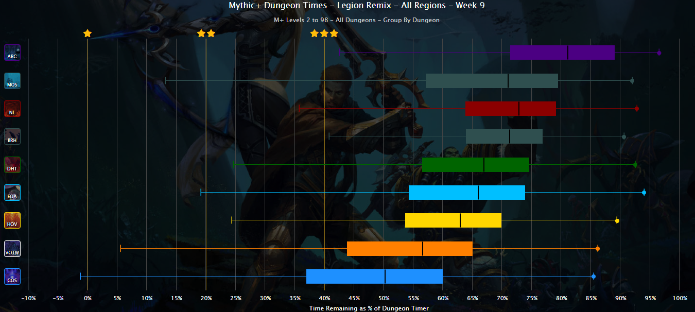 Comparing the pace between TWW S3 and Remix is night and day. TWW dungeons in week 9 saw 50% of their runs being done 11.02% to 25.72% below the timer. In Remix, this cut-off ranges between 50.28% to 81.09% below the timer. The fastest Arcway run was done in 3.48% of the official timer.