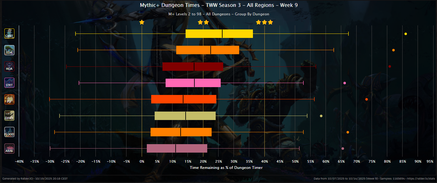 Eco-Dome (90.69%) is once again leading, slightly ahead of Gambit (90.16%). Streets of Wonder (88.02%) and Halls (85.69%) are still comfortably ahead of the lower half. Dawnbreaker (82.70%) and Priory (80.24%) managed to stay above 80%, with the latter once again having rough trash pulls due to the Ascendant affix. Floodgate (79.53%) is close behind, while Ara-Kara (76.30%) continues to beg for missing nerfs.