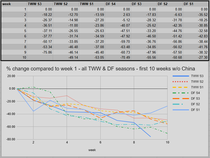 As expected, the weekly numbers fell off sharply. Given that the season has been going on for a while, and most players have reached their goals, this drop-off is not surprising. 48.26% fewer runs for the four regular regions makes this the biggest single decline of any seasons so far. In China, the drop-off was a bit smaller (-45.79%), bringing the global week-by-week decrease to 47.05%.