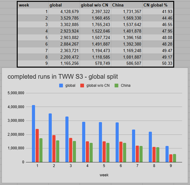 Week 10 so far is seeing slightly fewer runs. But the trend on Chinese servers is shifting much more strongly. For week 9, the region finally made it past 50% of global numbers for the first time. But that might be reversed in week 10. And we have yet to see how week 11 with uncapped crests and item vendors will play out.