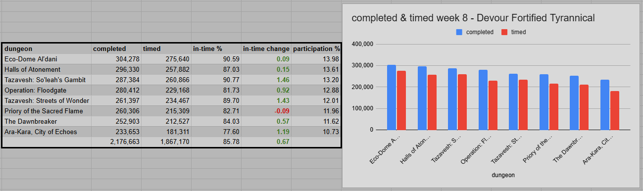 The eighth week of Mythic+ this season is over, and Nightstalker314 takes a look at the weekly data from Raider.IO. After the major drop-off in week 7, the week-to-week decline was smaller in week 8.
