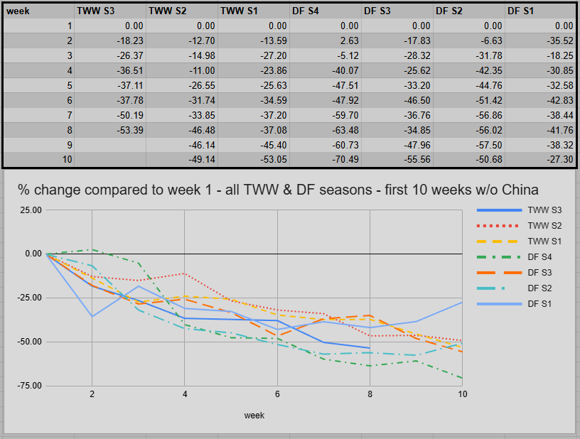 Since the season’s start, S3 has developed quite smoothly. A sharp drop after a dungeon week happened as expected. But with the start of Legion Remix and the staggered Turbo Boost rollout, early week 9 numbers have already fallen sharply.