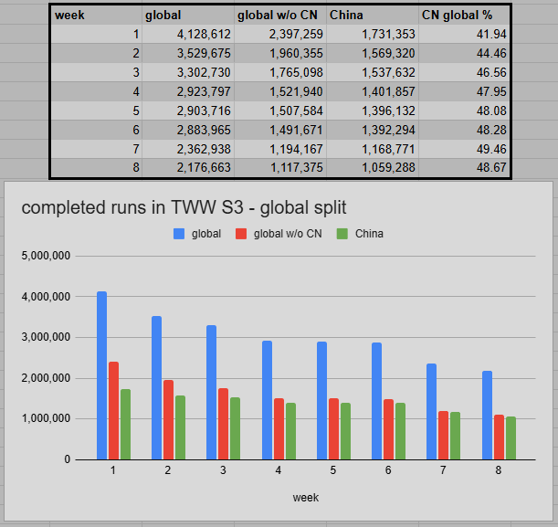 In week 8, China’s overall participation decreased slightly. This may be tied to a focused push towards +12 and higher in other regions. On Chinese servers, that shift happened earlier. China hasn’t yet crossed 50% of the global metrics, but early week 9 numbers show stronger M+ interest among Chinse players.