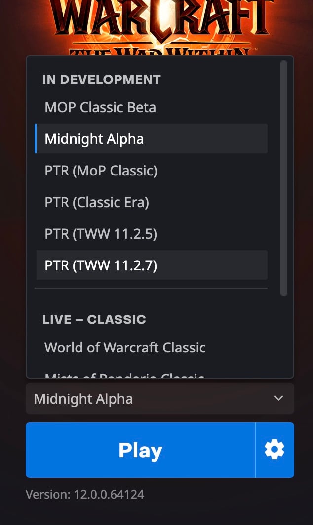 It’s simple. Open the Battle.net app, switch to the WoW section and from the game dropdown, select PTR (TWW 11.2.7) and hit the blue Install button. That’s it, you don’t need to pre-purchase Midnight to join the testing.