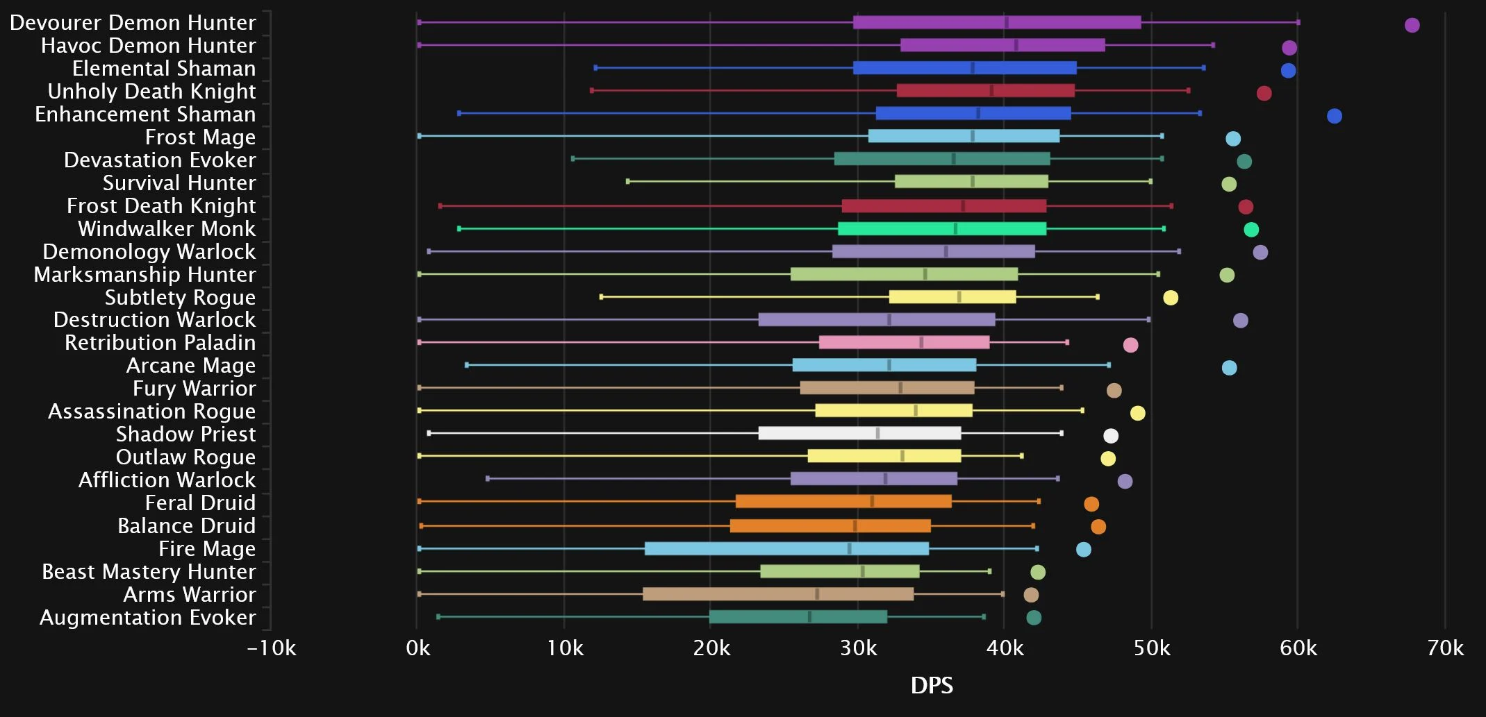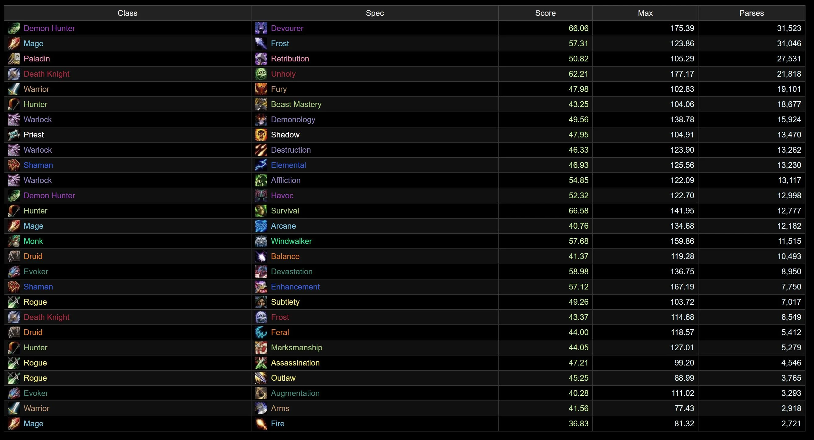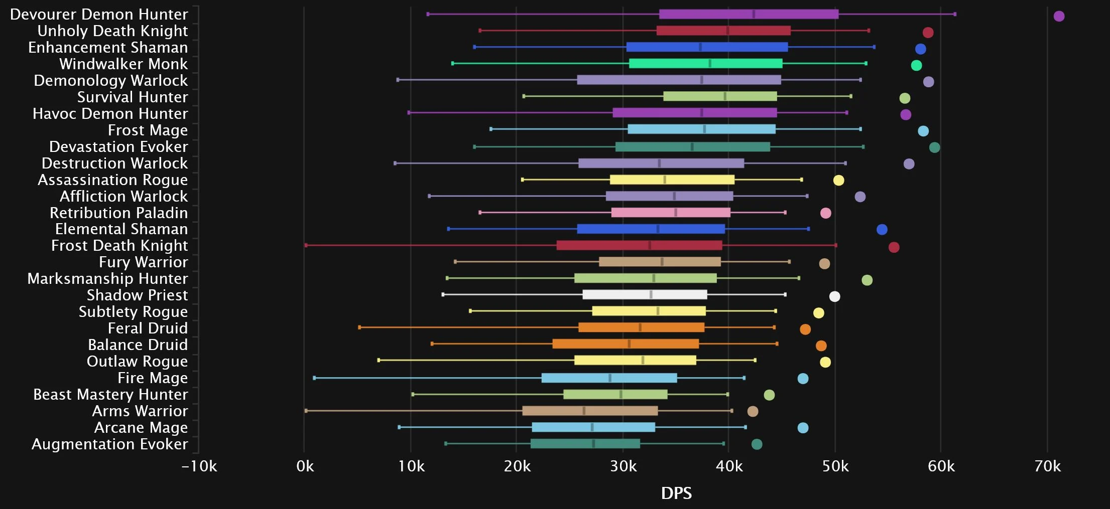 The damage logs themselves show exactly why Devourer has been gaining so many players (aside from simply being the new spec), as its domination extends even further than before. Even after Unholy’s giant 9-spot bounce back into 2nd place, it’s still nowhere close to the Demon Hunter. Demonology also skyrocketed from the bottom of the pack post-tuning, taking Affliction’s place in 3rd, with Destro moving from dead-last into 9th. Enhancement and Frost Mage also see big gains, while Devastation drops 4 spots to 6th, ahead of an also surging Windwalker. Down at the bottom, we see the once No.1 spec of TWW Season 3, as Beast Mastery joins the perpetually penultimate Augmentation, with a sprinkle of Arms seasoning the bottom 3.
