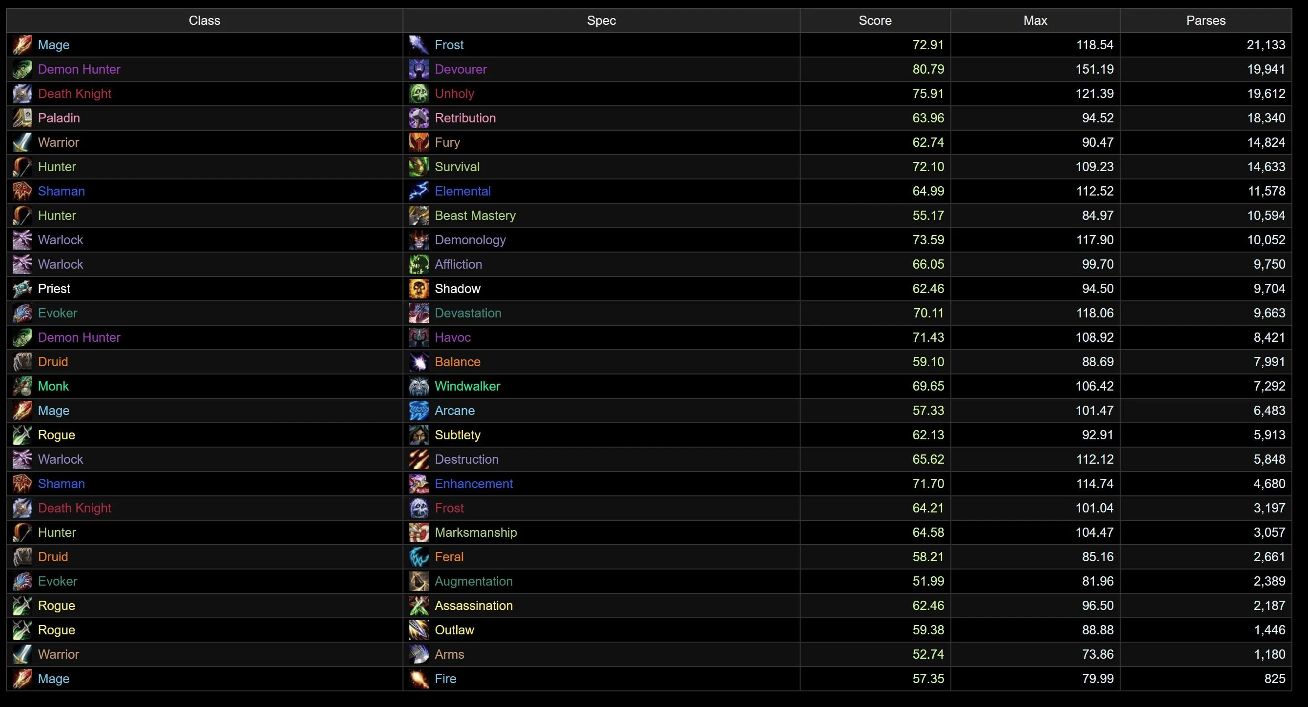 The generalist chart is very similar to the top parses, but we do see Frost Mage and Survival doing a little better, both edging out Enhancement. Havoc is also improved here, sitting in 7th. Affliction didn’t drop quite as far down, managing to hang on to the top 10, but just barely.