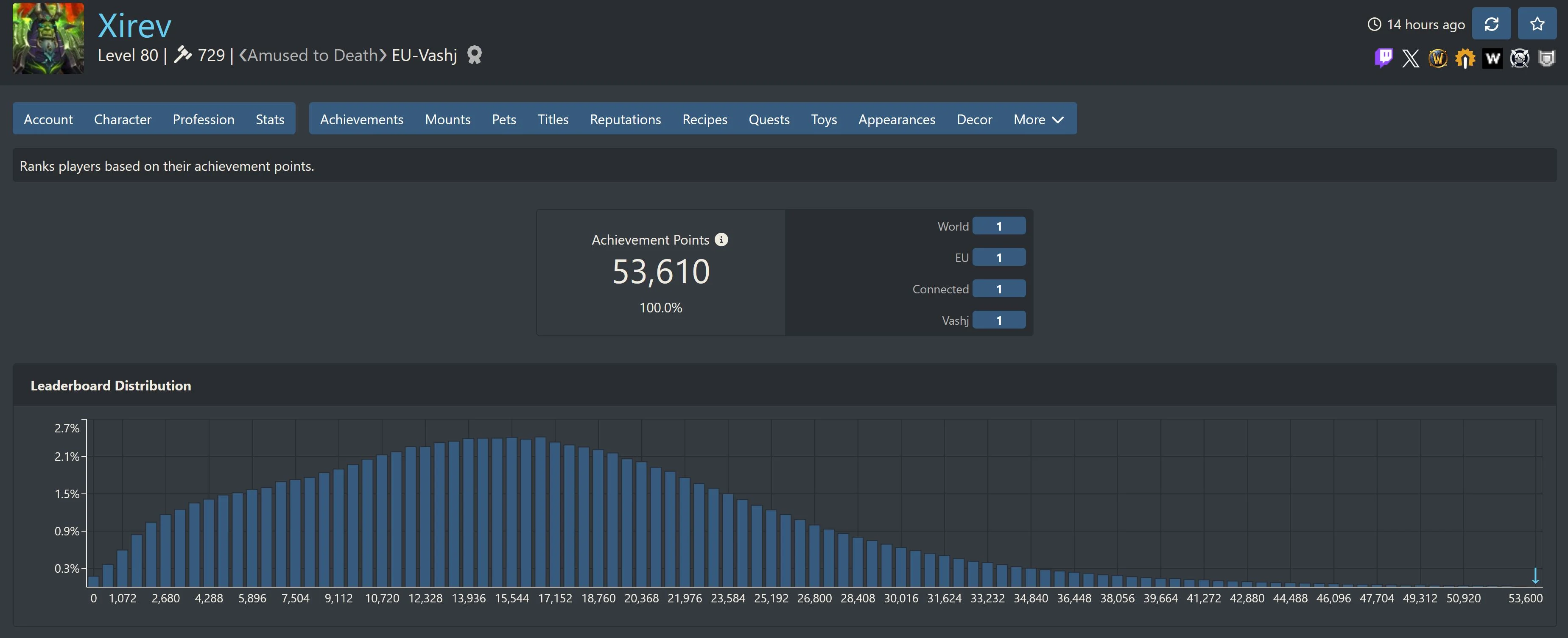 Xirev is back with another fully completed expansion, getting there before anyone else! He completed every achievement obtainable that grants points (so excluding some Feats of Strength). The obtainable part means that older achievements you can no longer get don’t count, and there are some that are simply impossible to get generally. Then there’s some bugged/mystery ones. This last category includes