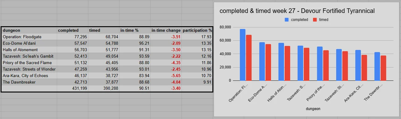 Only 64.97% of all keys were completed at key level 10 and higher. A split value we haven’t seen since week 3 of this season. Key levels 10 and 12 stayed as dominant as usual. But above that, participation fell off a cliff. At 15 and above, the share dropped by 48% and the total number of runs by 40%. From 20 upward, the carryover for total runs was even smaller, ranging from 29% to just 2.26% of the previous week’s value. The impact of decreased activity in China was massive. Meanwhile, lower key levels saw up to 35% more runs.