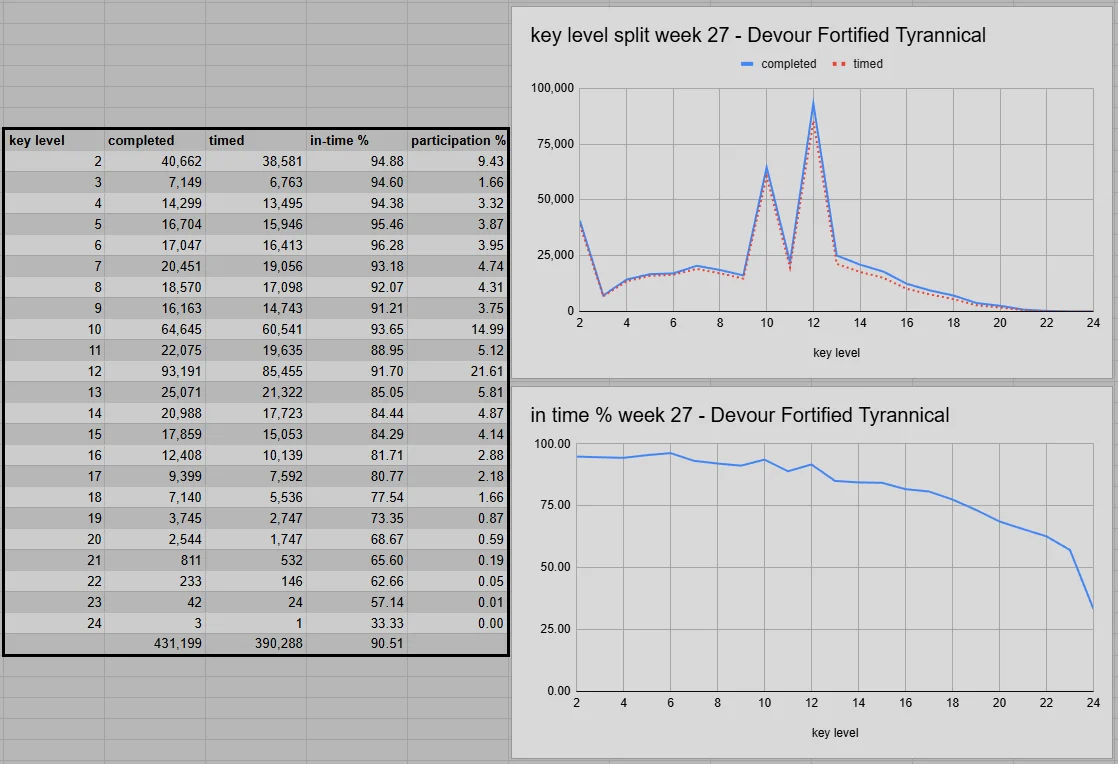 The major decrease in the success rate is rather odd, given that Devour is an easy affix. But a look into the key level split will reveal more later on. On average, the drop was 3.4 percentage points, down from 93.91% to 90.51%. Eco-Dome (95.21%) stayed on top, ahead of Gambit (93.59%) and Streets (93.01%). The only three dungeons that dropped less than the average. Halls (91.31%) remained in its usual fourth