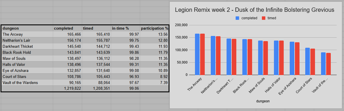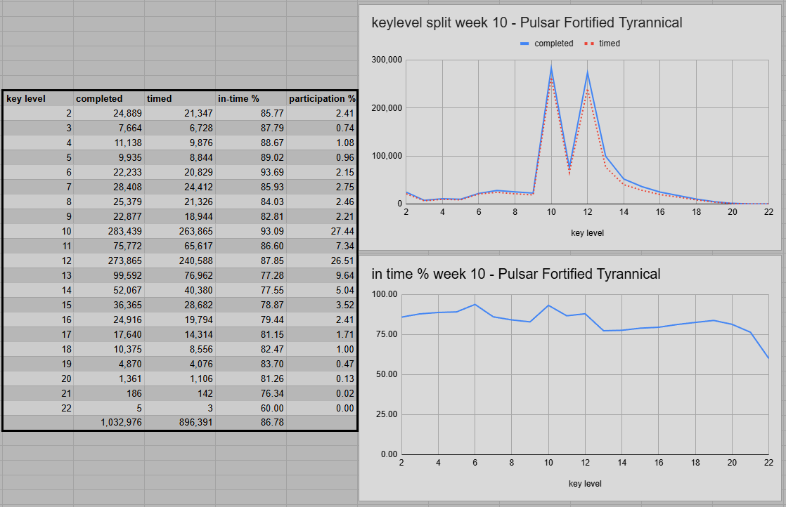 When comparing total numbers for retail and Remix, we have to keep in mind that Remix is currently a lot more engaging, but the runs are also a lot faster. In week 9, Remix m+ run numbers (544k) only matched up to 46.28% of retail (1.176m). In week 10, the ratio has flipped, and Remix (1.22m) is showing 118.11% of retail’s numbers (1.033m).