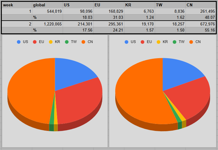 Overall, the numbers have more than doubled when comparing Remix weeks 1 and 2. The individual regions, though, have seen vastly different increments. For the European servers, it was a lot smaller (x1.75) since players were already a lot more active in week 1. Korea (x2.83) and China (x2.57) are at the other end of the spectrum.