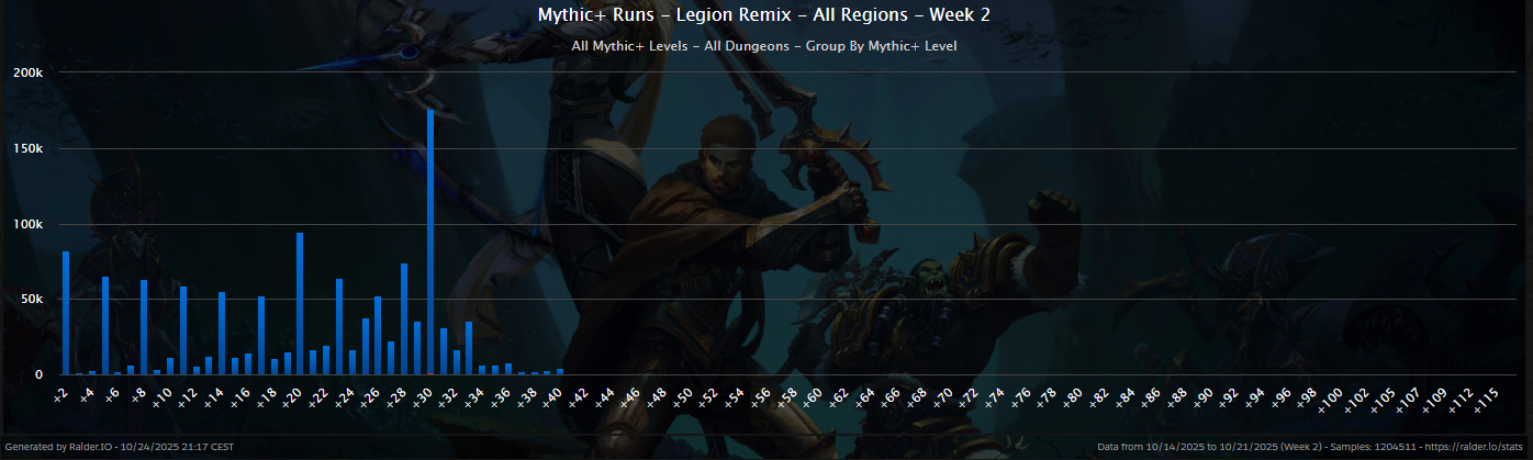 For the near future, completing keys at levels 40 and 49 for further rewards may be the next carrot on a stick. For now, the total run numbers on those levels are one or two orders of magnitude behind. But the success rates are still beyond 90%. And the absolute limit of this mode in Remix is still unknown. Maybe we’ll already see the first +170 or +180 key timed within the next weeks.