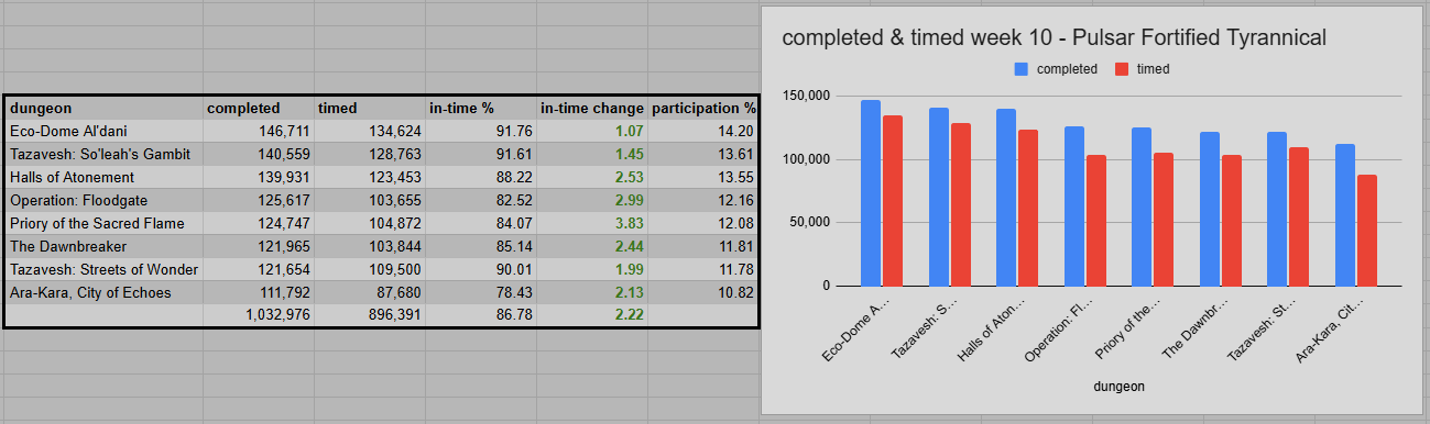 Eco-Dome (91.76%) remained the easiest dungeon, just ahead of Gambit (91.61%). Streets of Wonder (90.01%) is once again in 3rd place, followed by Halls (88.22%). Dawnbreaker (85.14%) was leading the lower half with the usual distance. Priory (84.07%) improved quite a lot, despite trash being boosted by Fortified from 7 to 9. But the absence of the Ascendant affix also helped a lot, compared to week 9. Floodgate didn’t fall too much behind with 82.52% and Ara-Kara (78.43%) has yet to receive a major nerf, being 4 percentage points behind.