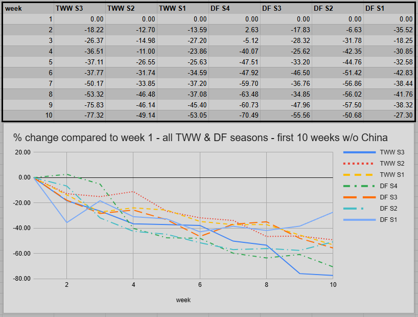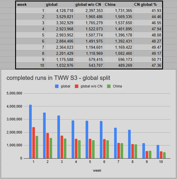 In week 9, we saw the biggest drop-off in a regular week for all seasons. Week 10 only slightly dropped below that level of activity. The 4 regular regions saw 6.16% fewer runs. The global number dropped by 12.13% in week 10 because the Chinese run numbers fell by 17.93%. Over there, they shifted a lot stronger from farming retail keys to blasting Remix. Week 11 could see a decent rebound, but long-term, Remix is drawing engagement away from retail.