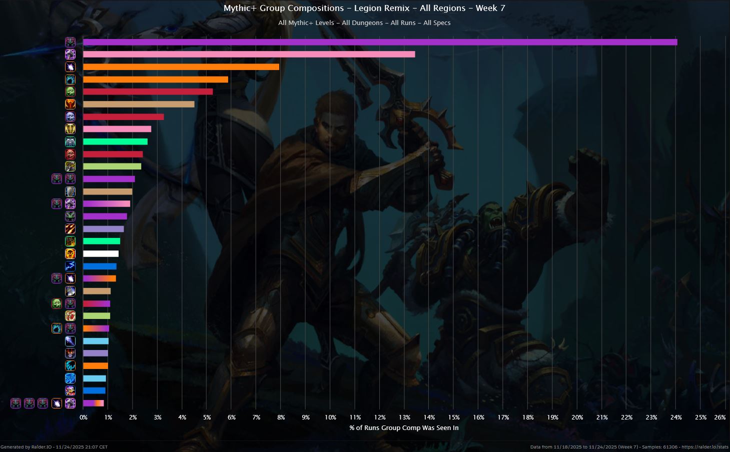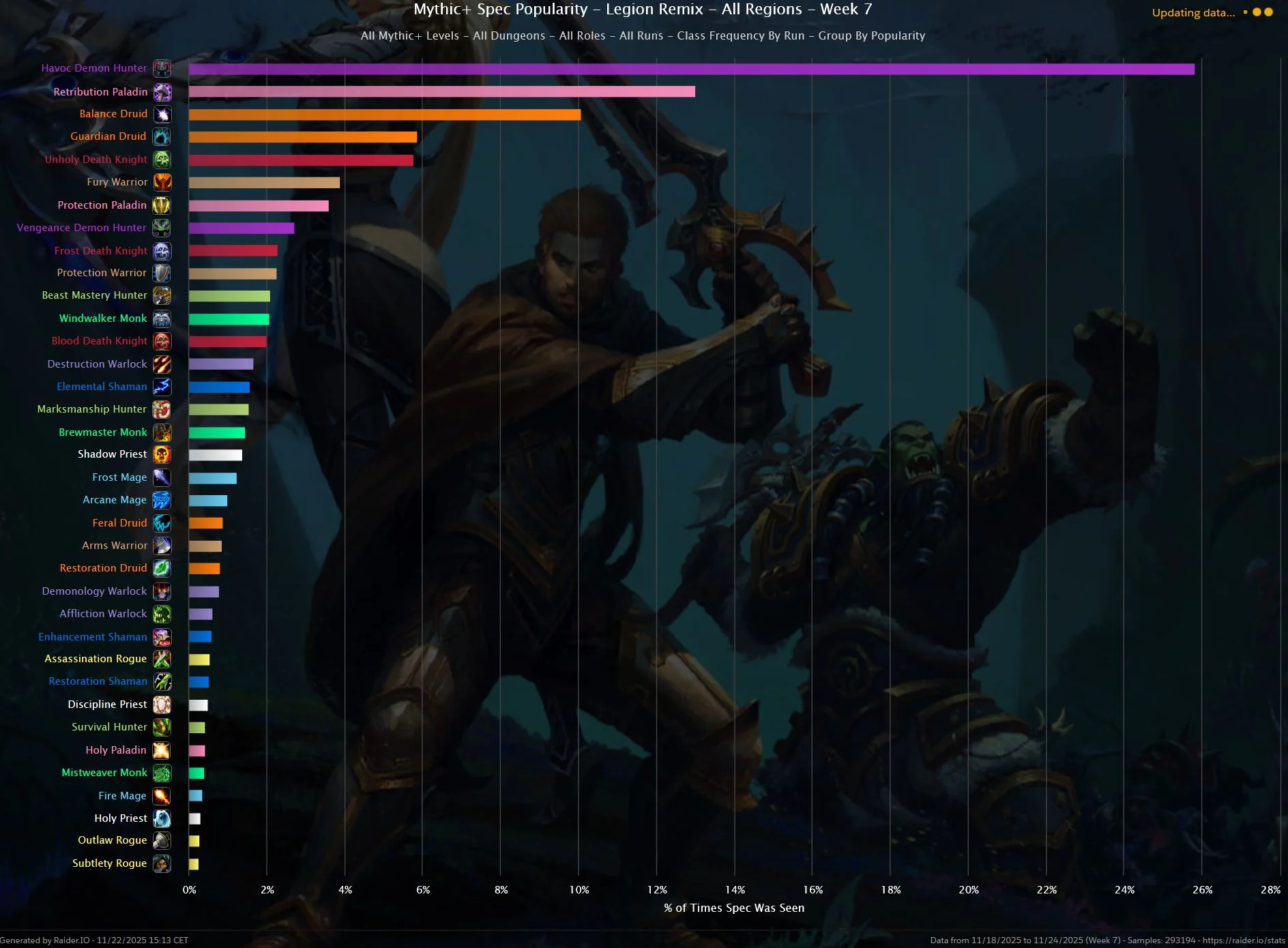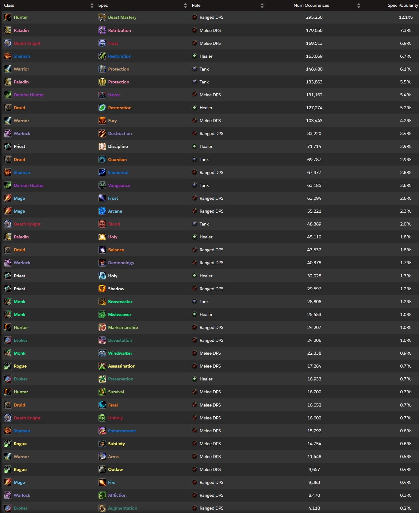It’s time to play “how much has Havoc gained this week” over in Remix! And the answer is… – 1.7%! That’s right, the top spec in Remix has lost some ground. In regular season charts, that 1.7% would be a significant chunk of a spec’s popularity, but for Havoc in Remix, it just means it still has slightly over a full quarter of all the played runs, landing at 25.6%. Retribution also dropped a bit, while Unholy gained some ground and is neck-and-neck with Guardian for that 5th spot.