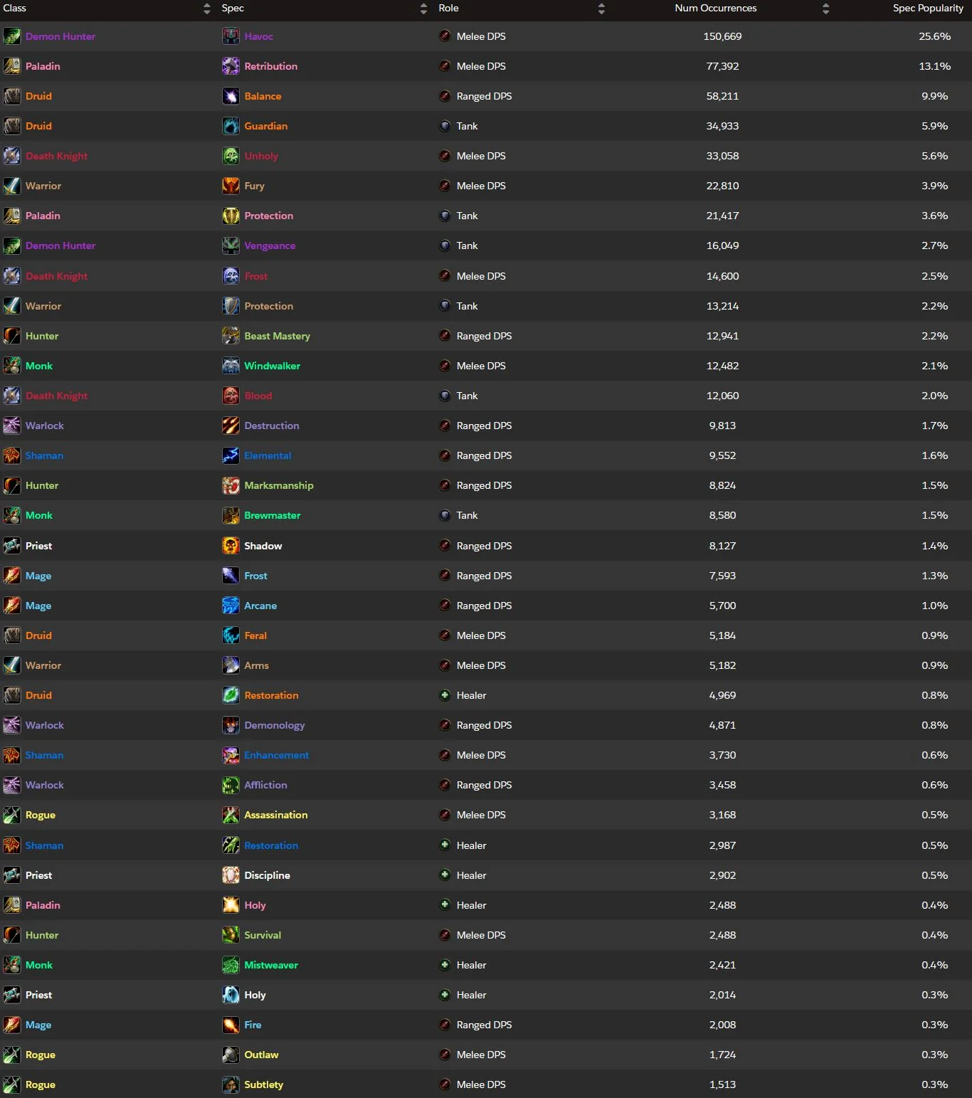 The data used in this article comes from Raider.IO‘s excellent analytics tools, taking into account all Mythic+ runs across all levels of play. The data is focused on this past reset and not on the season as a whole.