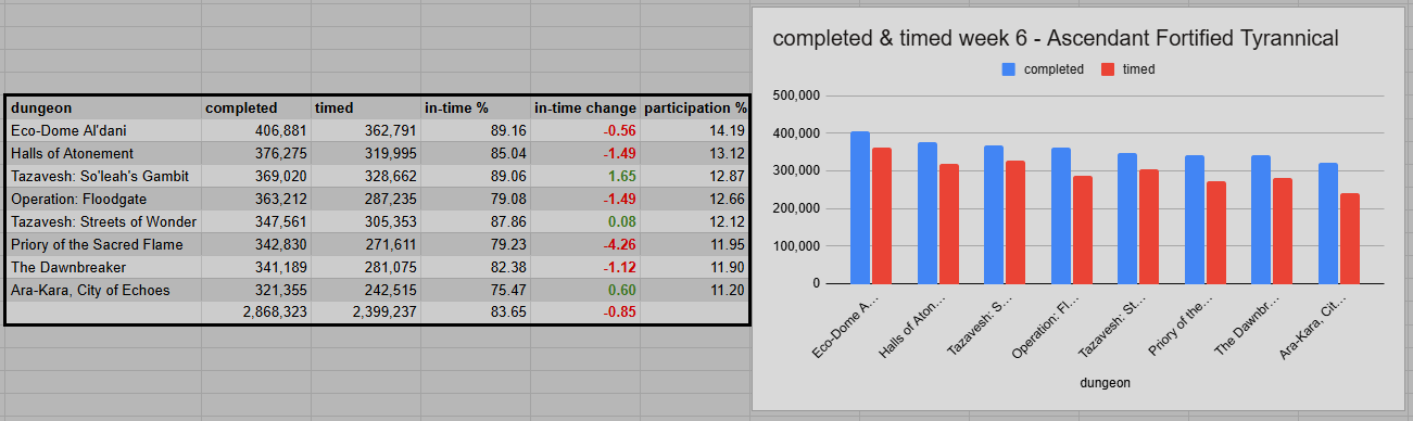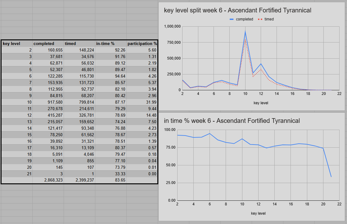 The overall success rate dropped by 0.85 percentage points, down to 83.65%. Given the bigger interest in lower keys for the event quest, the impact of Ascendant as the worst affix is showing once again. Combined with Fortified, it turns trash pulls or key level 7-9 into a worse experience overall. Eco-Dome (89.16%) ended up just ahead of Gambit (89.06%), which might take the crown within the next few weeks. But the latter also benefits from the smaller impact of Fortified first in a 5-boss dungeon. Streets of Wonder is still doing well at 87.86%. Slightly behind, we have Halls of Atonement at 85.04%. It dropped quite a bit from last week. The massive pulls in the first half of the dungeon suffered from the affix combination.