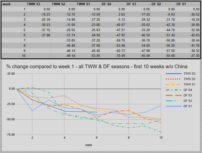 Across all regions, drop-offs are just 1.1%. Comparing just the four regular regions, we are looking at 1.18%. Three weeks of almost stable numbers are quite unusual. However, a major dip is expected in week 7. After a dungeon week, the drop-off usually turns out a lot bigger than on average.