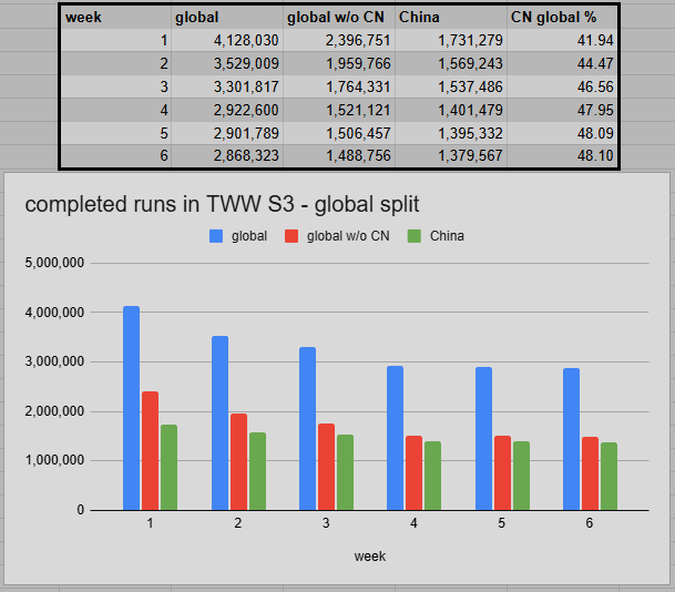 Looking at the global metrics, we can see that China has almost solidified a 48% share by now. Once the Turbo Boost starts, this could shift by a few more points and tip the region over 50%. Though we can’t really tell how big the effect of the Legion Remix will be per region. This time, it’s staggered a bit more compared to Pandaria Remix in DF S4. That season was also seen as rather insignificant by many, and M+ activity dropped by 30% back then.