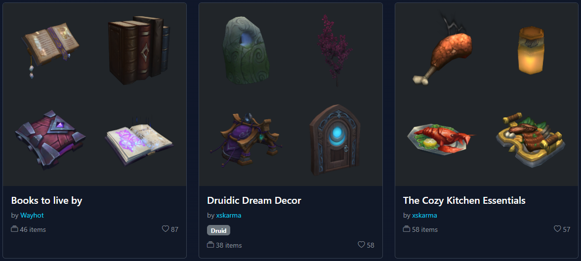 Need inspiration? The Decor Item Sets section showcases community-curated collections of themed decor. Whether you’re designing a cozy kitchen, a grand library, or a dark arcane study, these ready-made sets help you find cohesive combinations without the headache of endless searching.