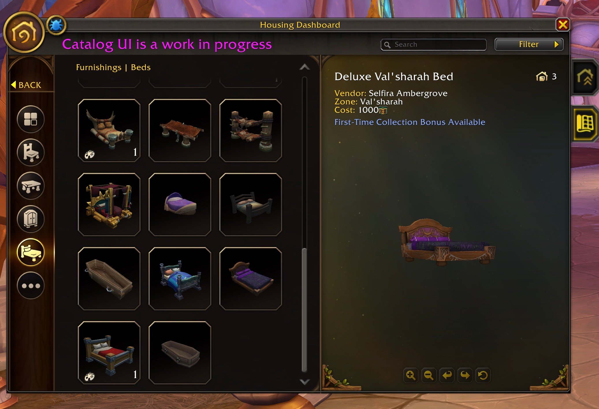Click on any piece of decor in the catalog and you’ll see where it comes from Want that Deluxe Val’sharah Bed? The UI will point you to Selfira Ambergrove in Val’sharah and let you know it costs 1,000 Order Resources!