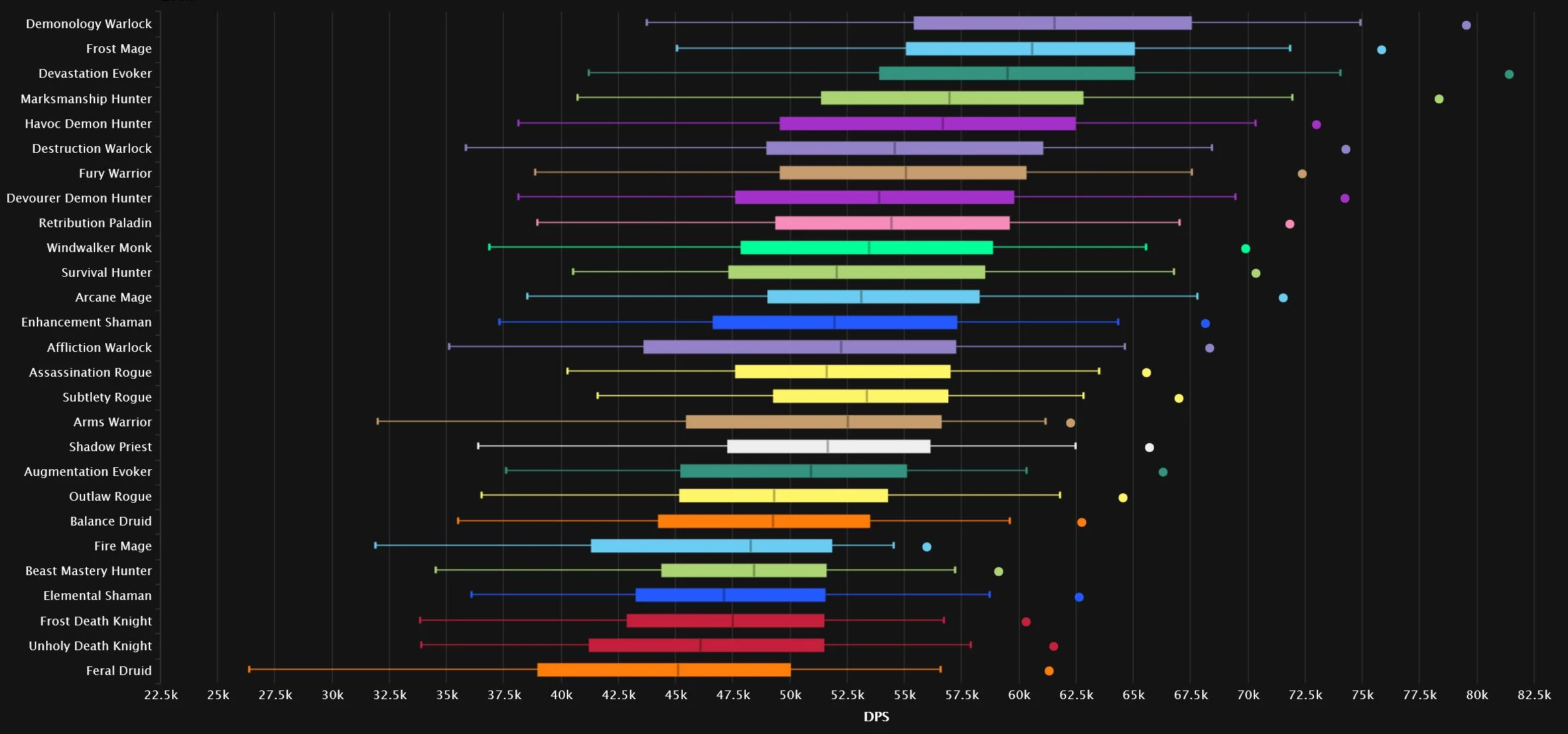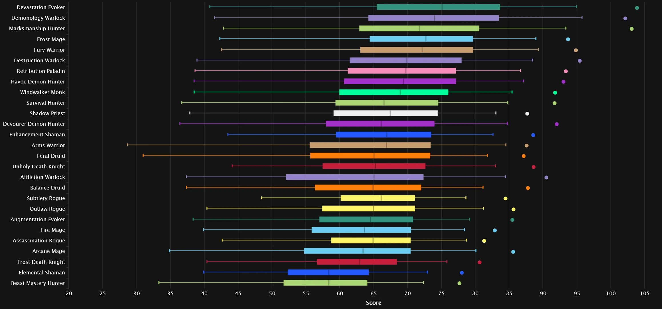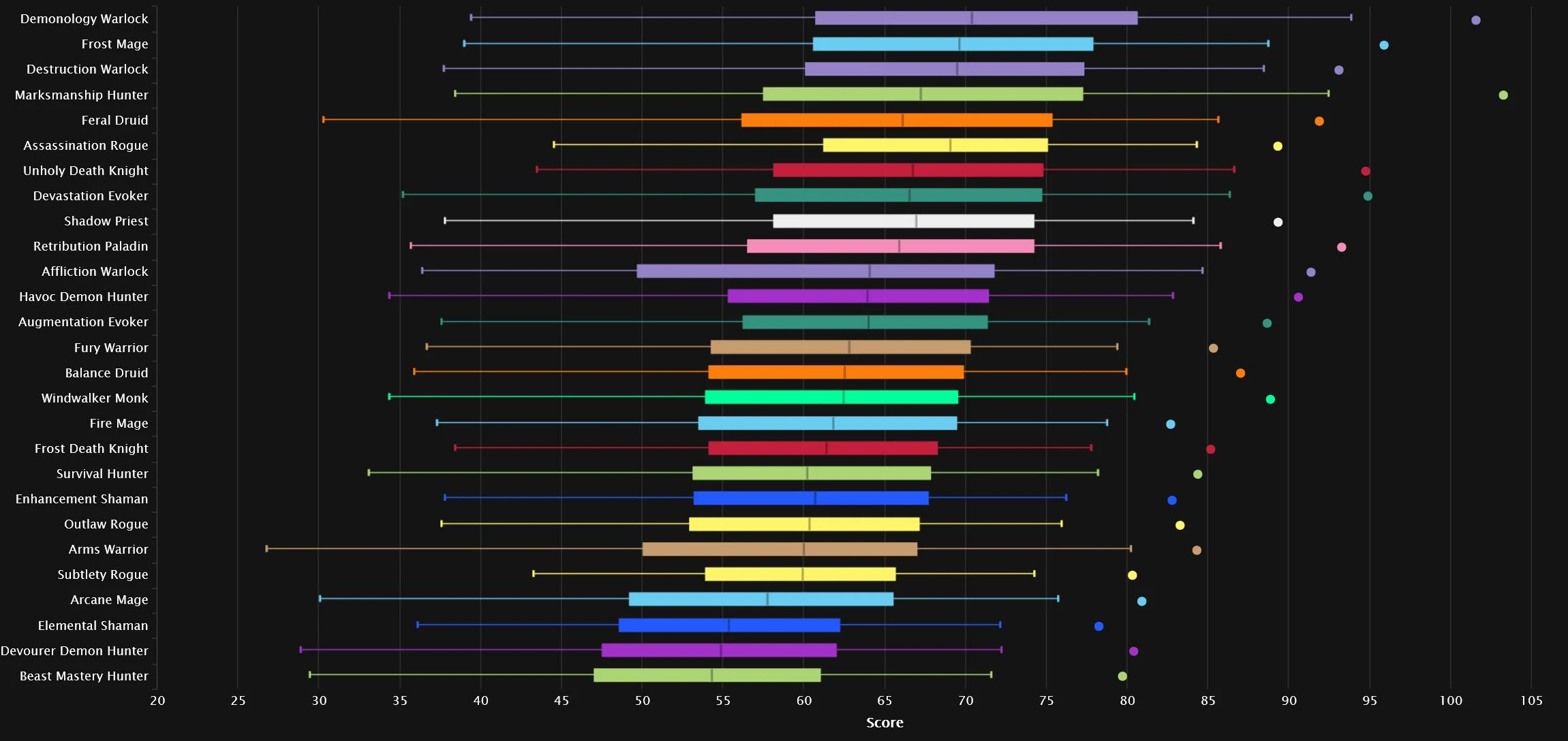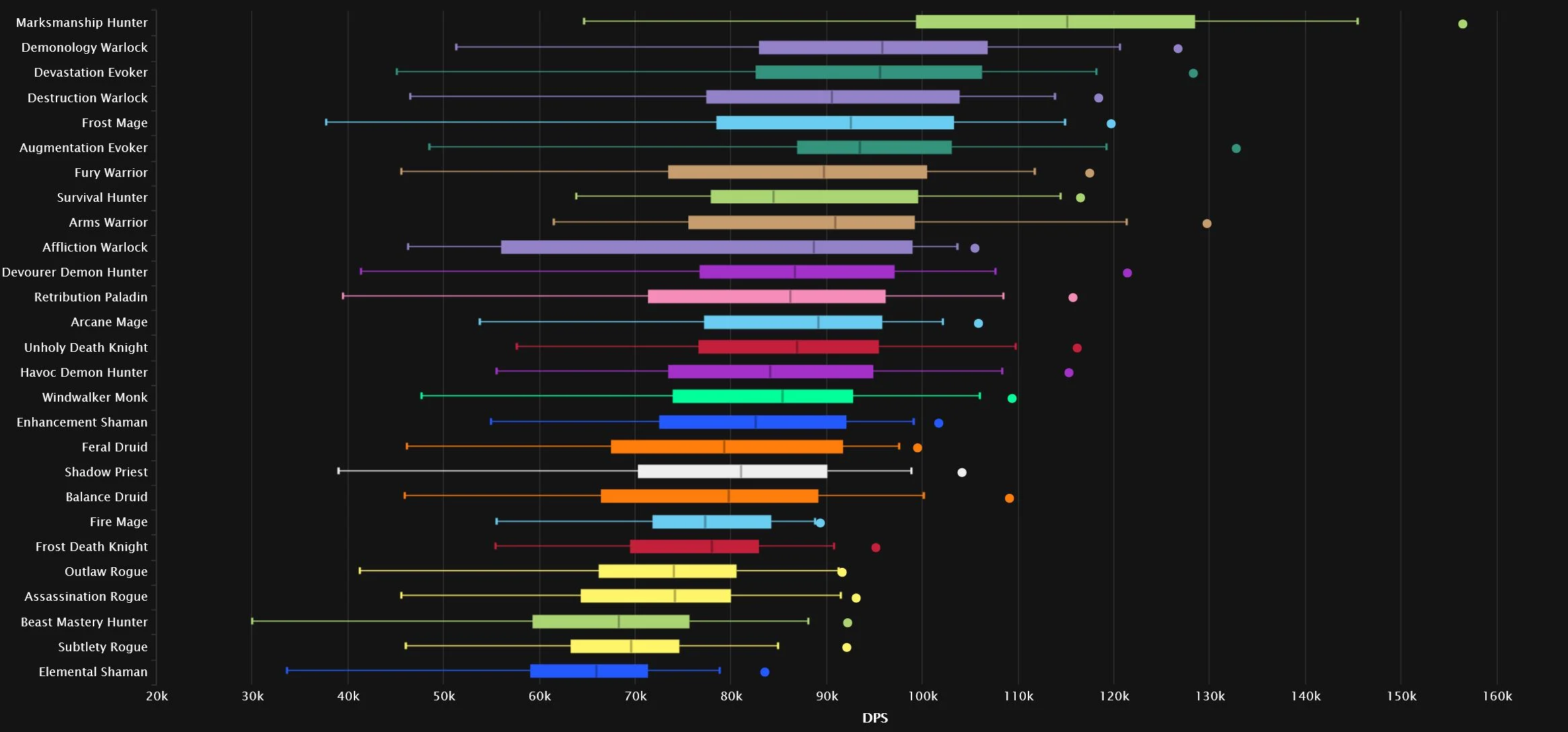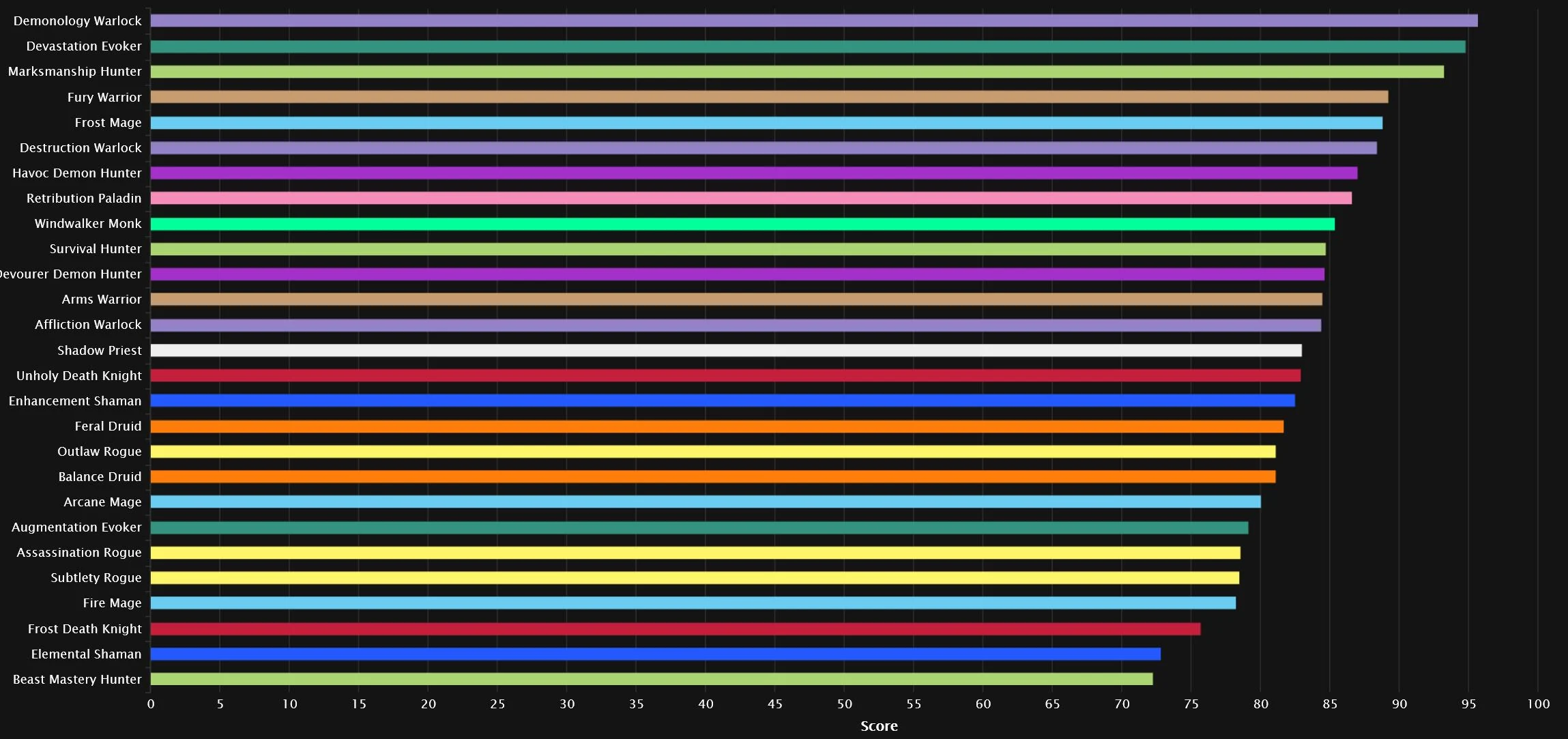 We have two specs very close together at the very top, as Demonology grabs the No.1 spot and Devastation makes a comeback! Marksmanship is also relatively close to the top two, while everyone else is a bit more behind. The new spec in town didn’t quite manage to break the top 10 after its 4% nerf, but it’s sitting right outside. We have two Warlocks in the top 10, one of two classes to get that distinction, as Destruction claims No.6. The other double-top-10 class is Hunter, as Survival snags the final top 10 spot.