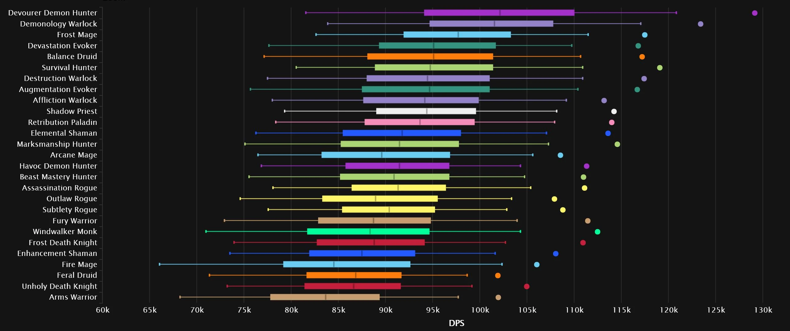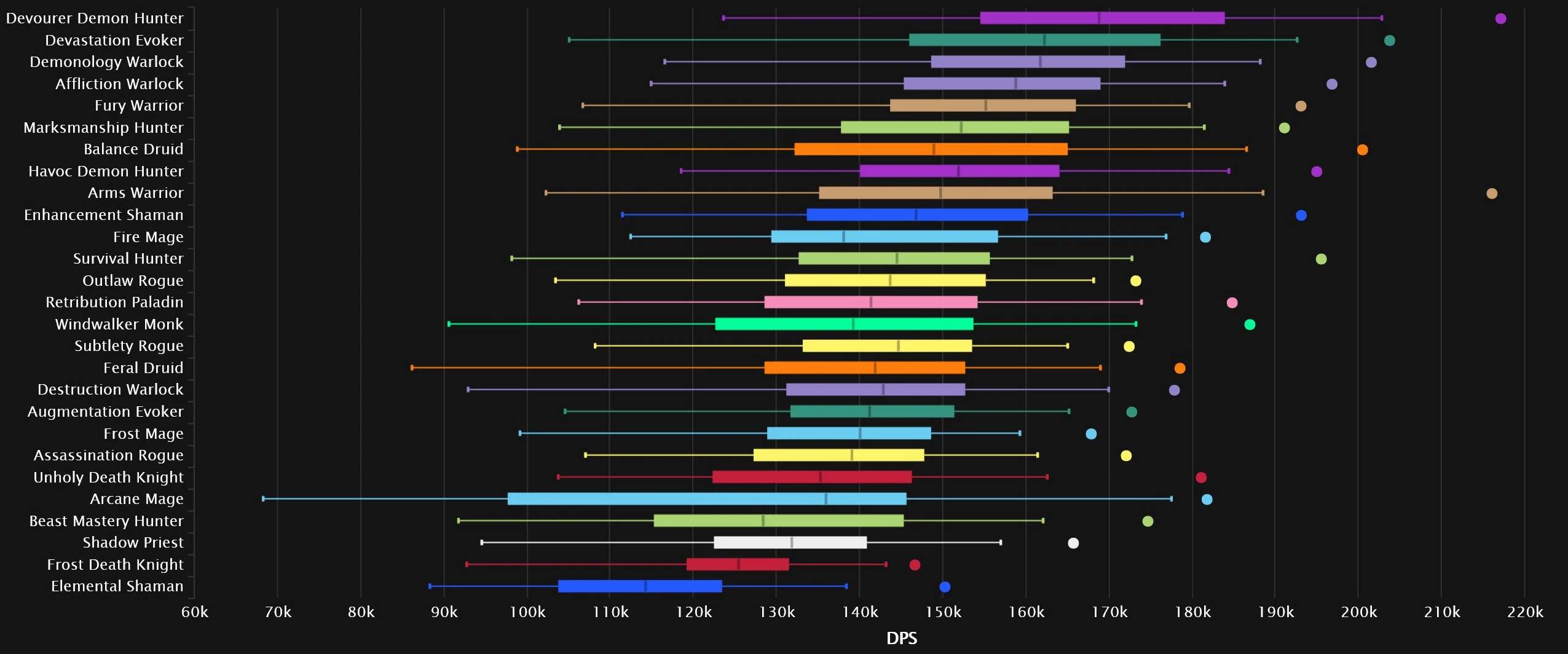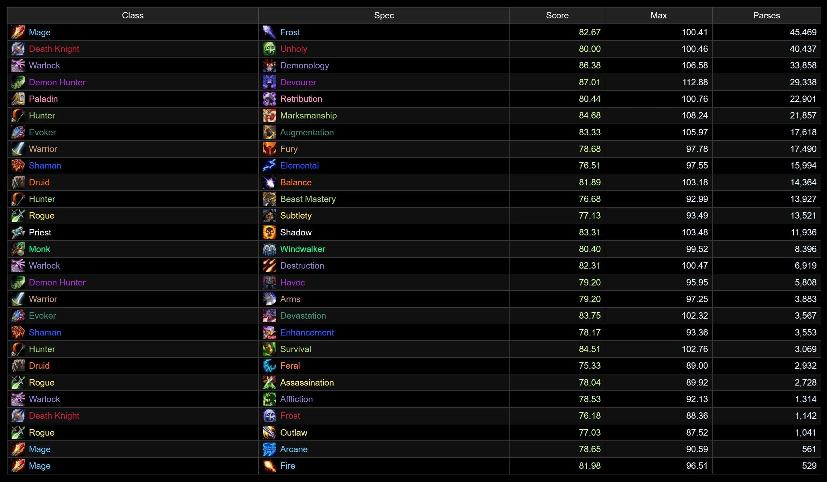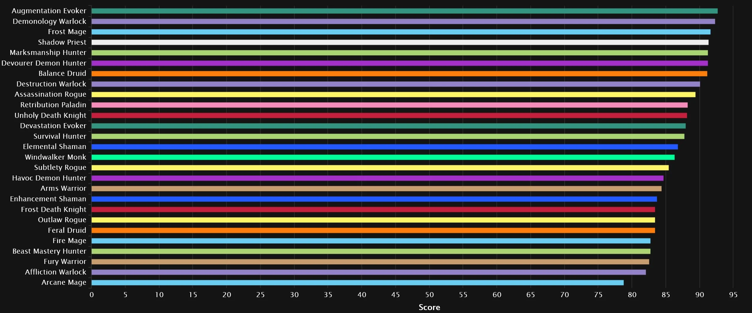 Devourer has dropped off quite a bit since last we checked in, falling 5 spots from No.1, which is now claimed by Augmentation. A Warlock remains steady at No.2, but it’s a huge shift in specs, as Demonology skyrockets 8 spots up, while the former silver occupant, Destruction, drops 6 to No.8. Frost, Shadow, and Marksmanship all move one space up. As one Evoker rises, another falls, with Devastation losing 5 spots, leaving Balance in its previous No.7 spot. The bottom 3 features Arcane, with Fire just a little outside it, as Affliction and Fury grab the remaining two slots.