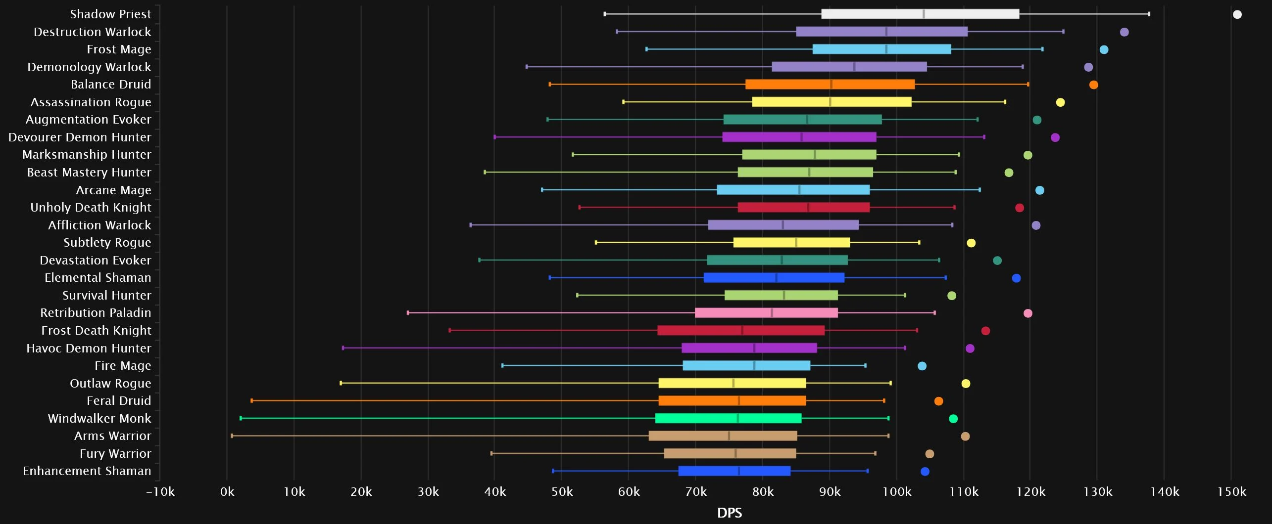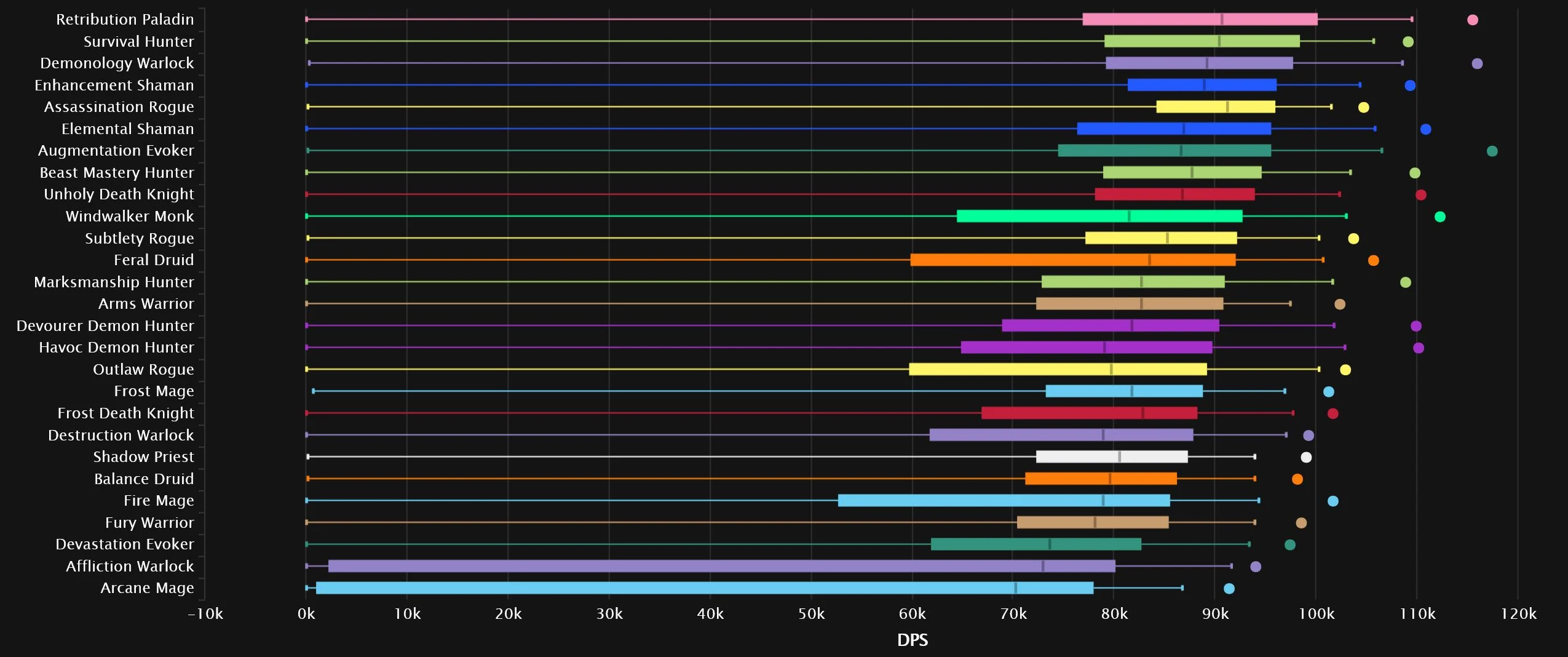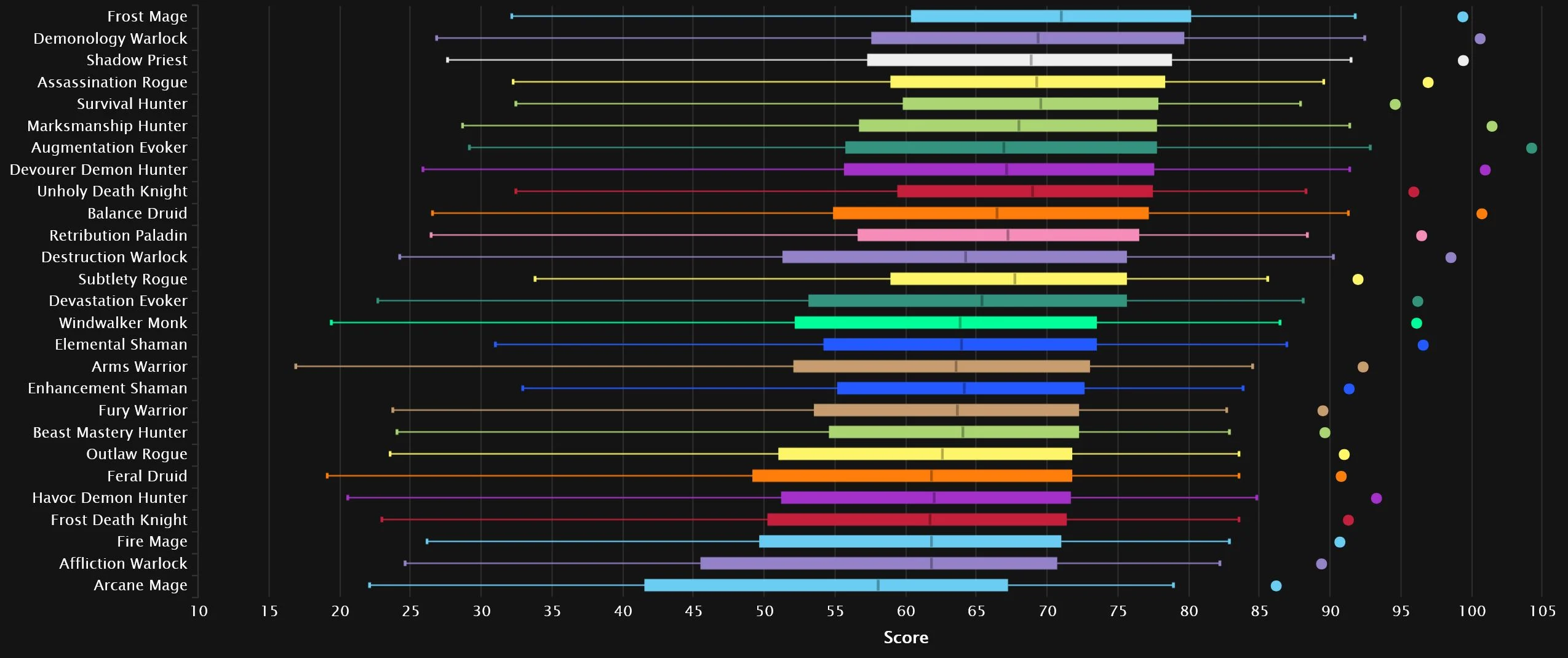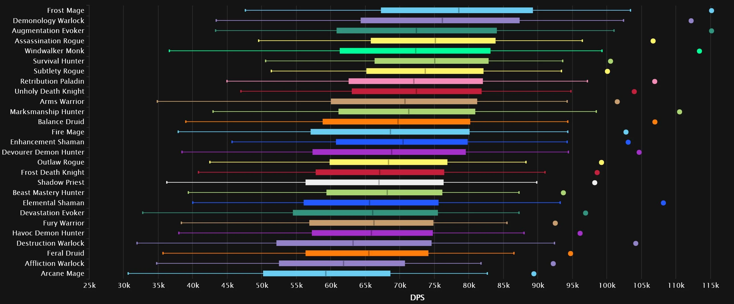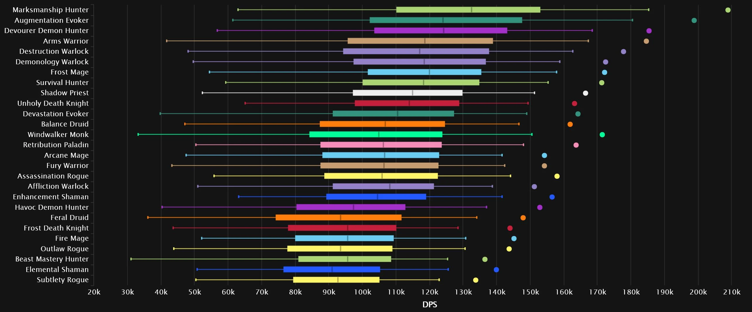 Devourer has dropped off quite a bit since last we checked in, falling 5 spots from No.1, which is now claimed by Augmentation. A Warlock remains steady at No.2, but it’s a huge shift in specs, as Demonology skyrockets 8 spots up, while the former silver occupant, Destruction, drops 6 to No.8. Frost, Shadow, and Marksmanship all move one space up. As one Evoker rises, another falls, with Devastation losing 5 spots, leaving Balance in its previous No.7 spot. The bottom 3 features Arcane, with Fire just a little outside it, as Affliction and Fury grab the remaining two slots.