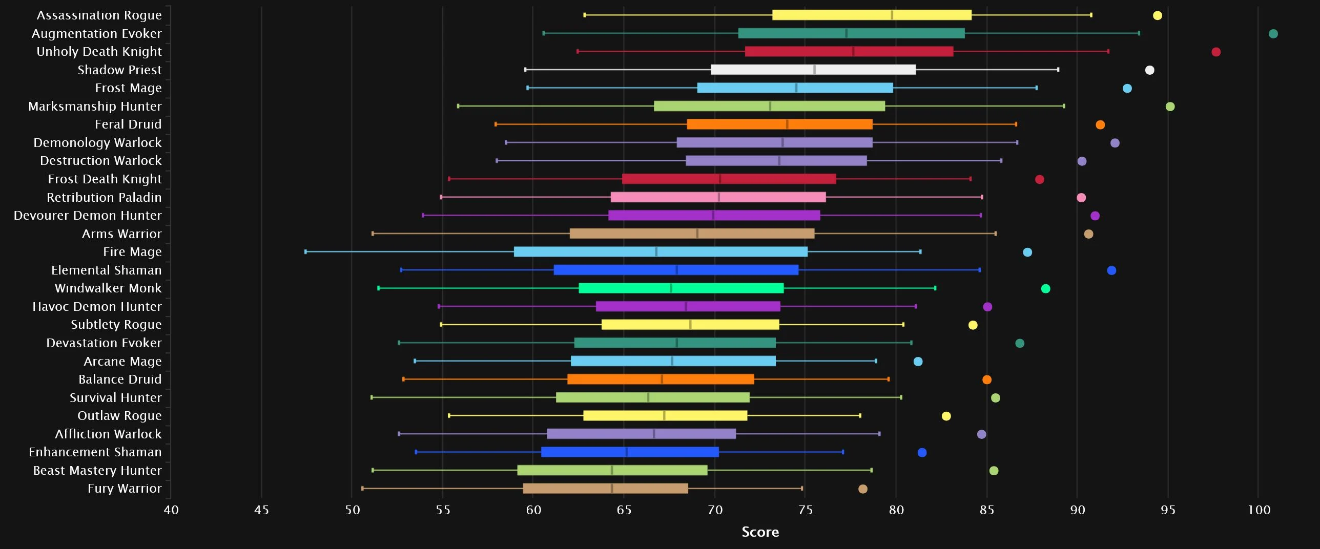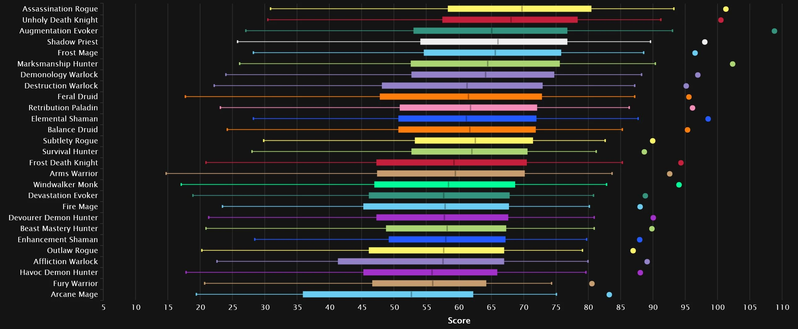 The generalist bracket sees some major changes from the top percentiles, as Shadow is doing a whole lot better, slotting into No.3! Assassination is also living the life, with Survival surging as well. Augmentation is all the way down in 7th, leaving Frost Mage and Demonology to rule the roost. Unholy and Balance round out the top 10, while Fire makes it into the bottom 3 here after all.