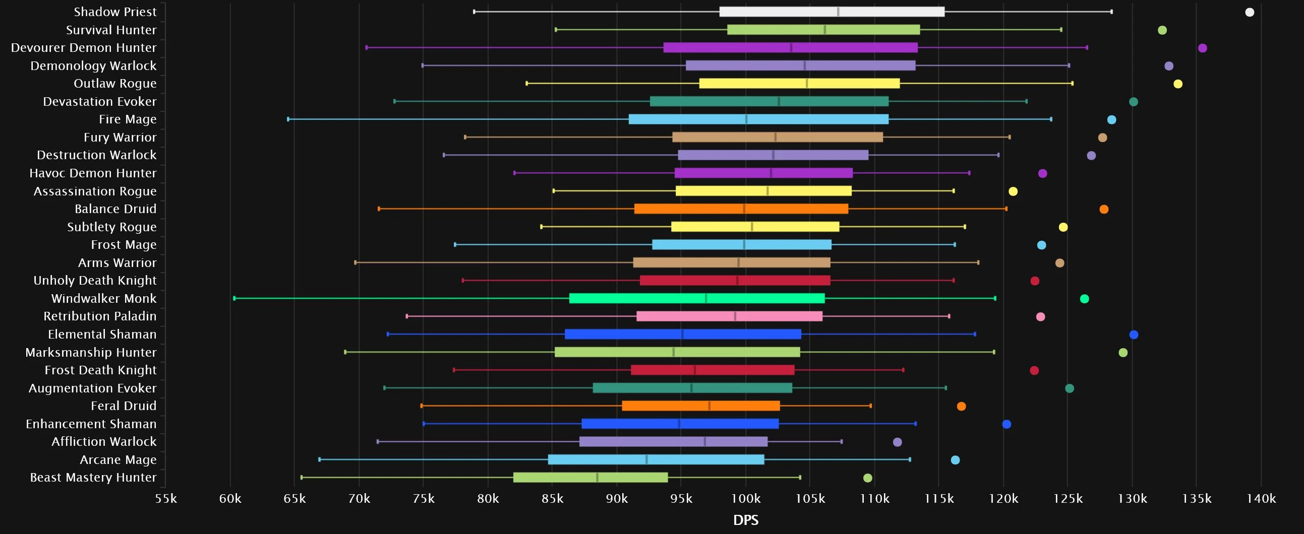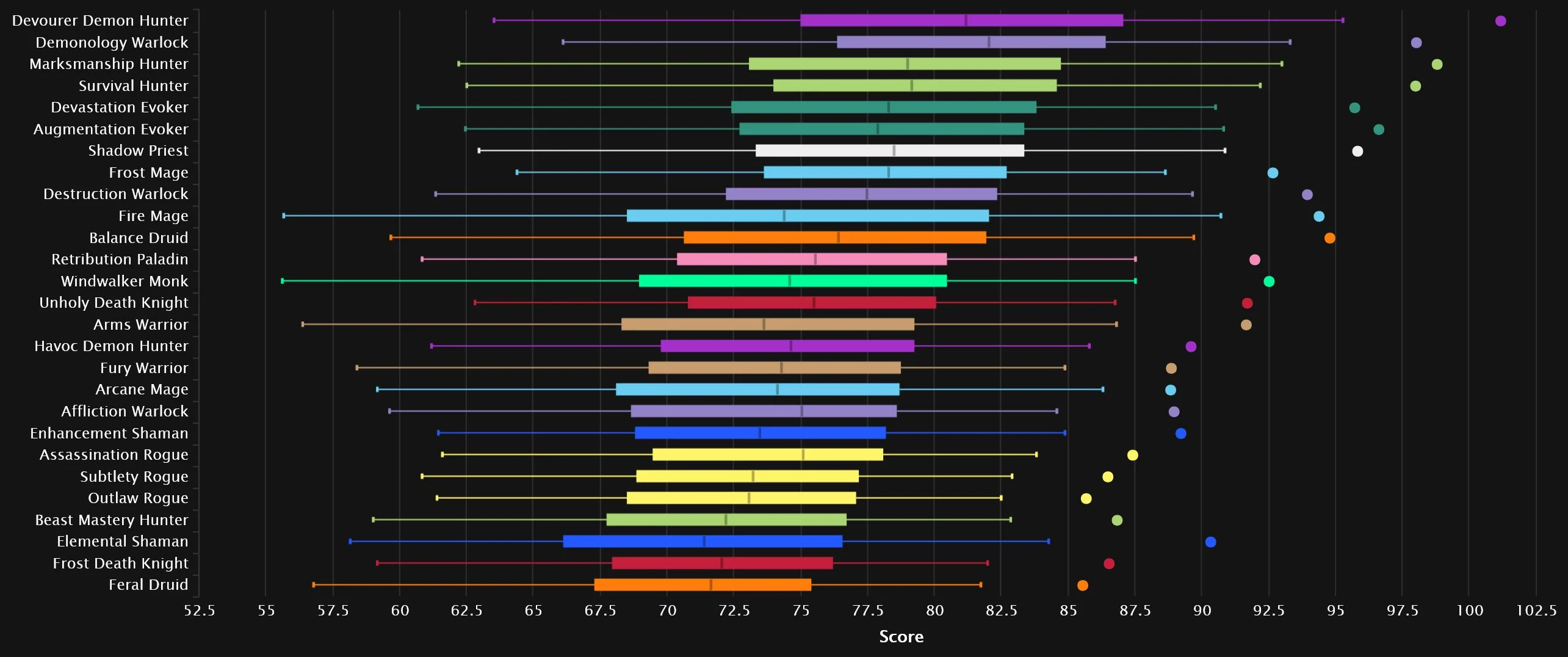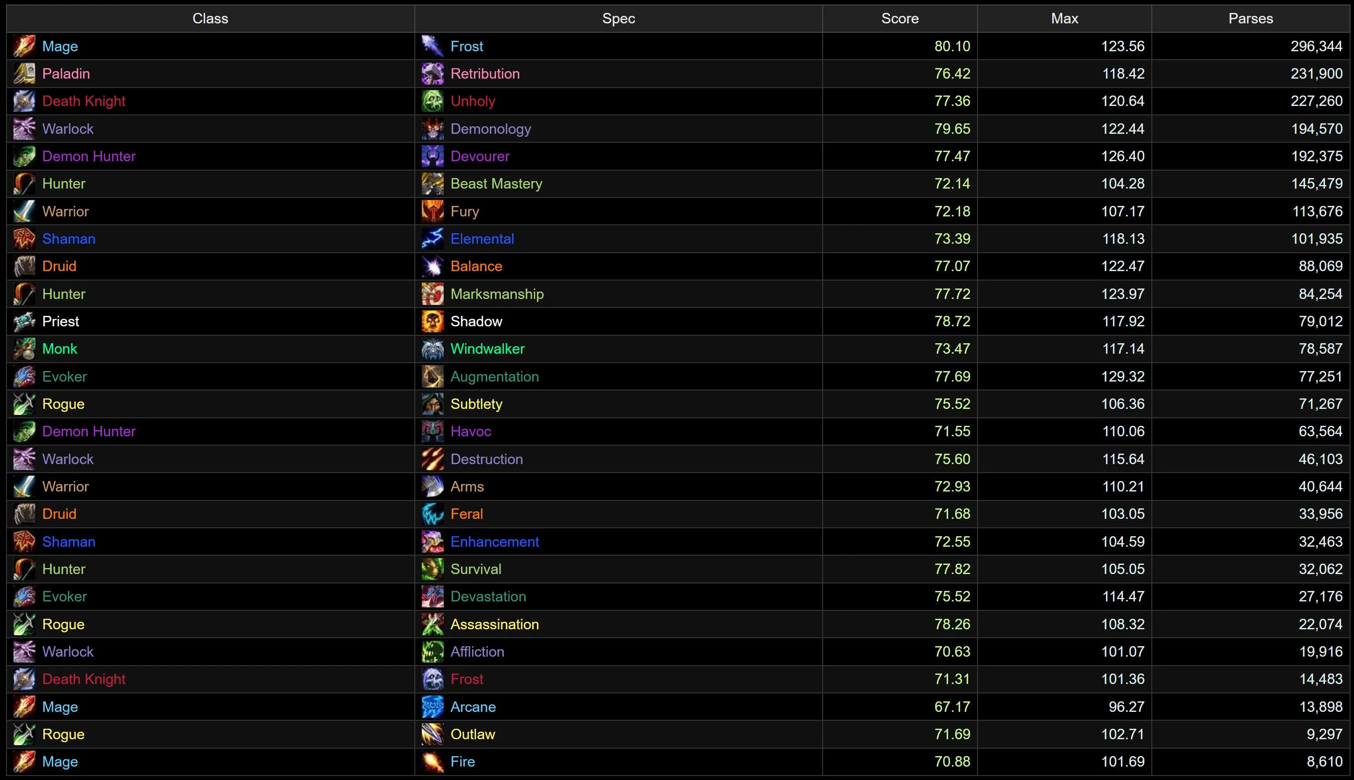 The top two remain very stable since last we checked, with the Devo/Demo combo still ruling over the rest. Survival moves up a few spots to claim fourth, while Marksmanship pulls off a huge 7-spot move to grab that bronze slot. The Evokers banded together, as Augmentation rises 9 spots to join the very stable Devastation. Shadow also benefited a lot from that last set of buffs, getting the most-improved trophy, with 12 spots gained. There is some good news for non-Frost Mages, as Fire managed to get a hold of a top 10 spot, only two below Frost! Arcane isn’t doing as badly as in Heroic either, but does find itself in the bottom half of the chart. At the very bottom, we find some new faces, as Elemental, Frost DK, and Feral aren’t doing too well in Mythic.