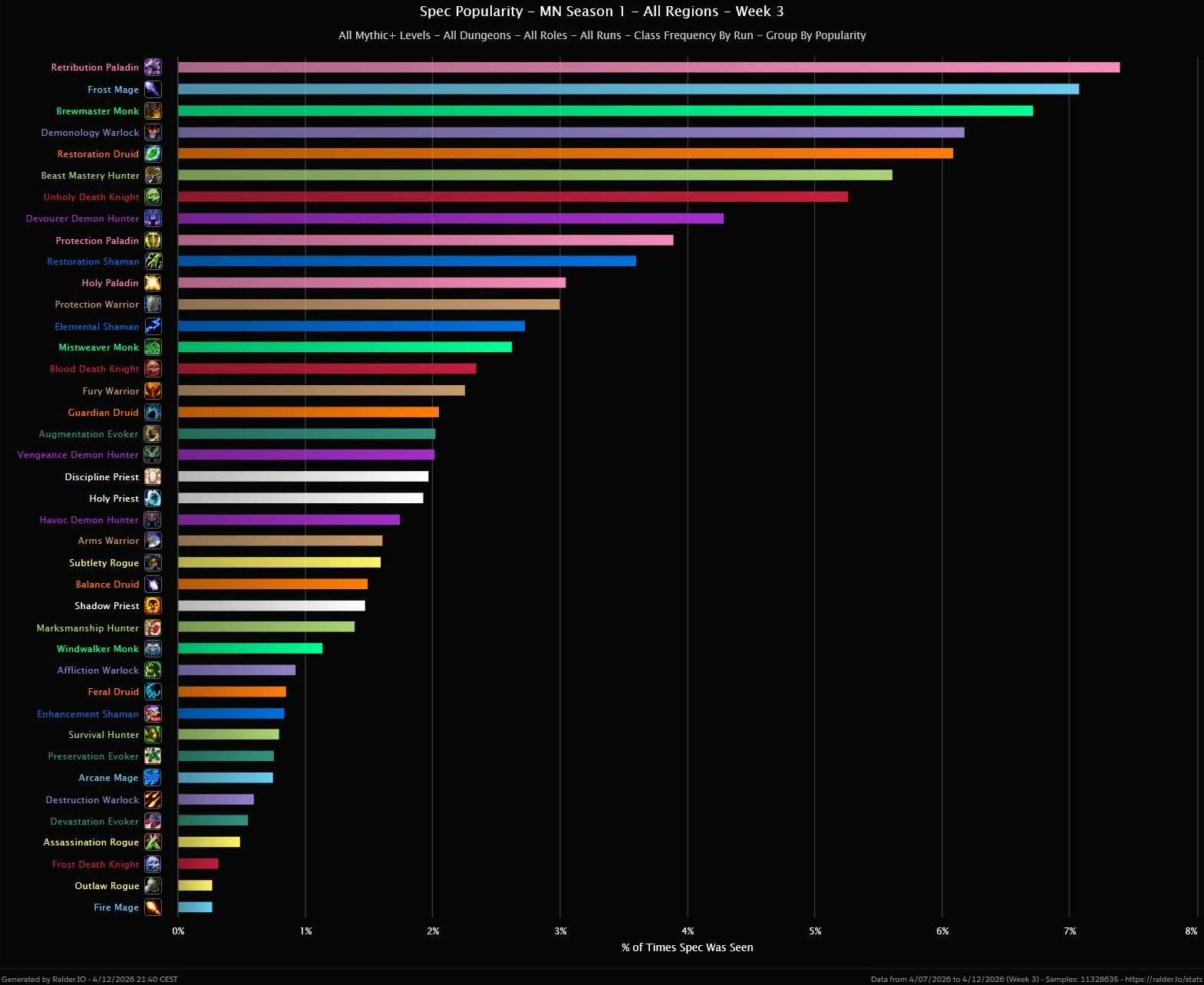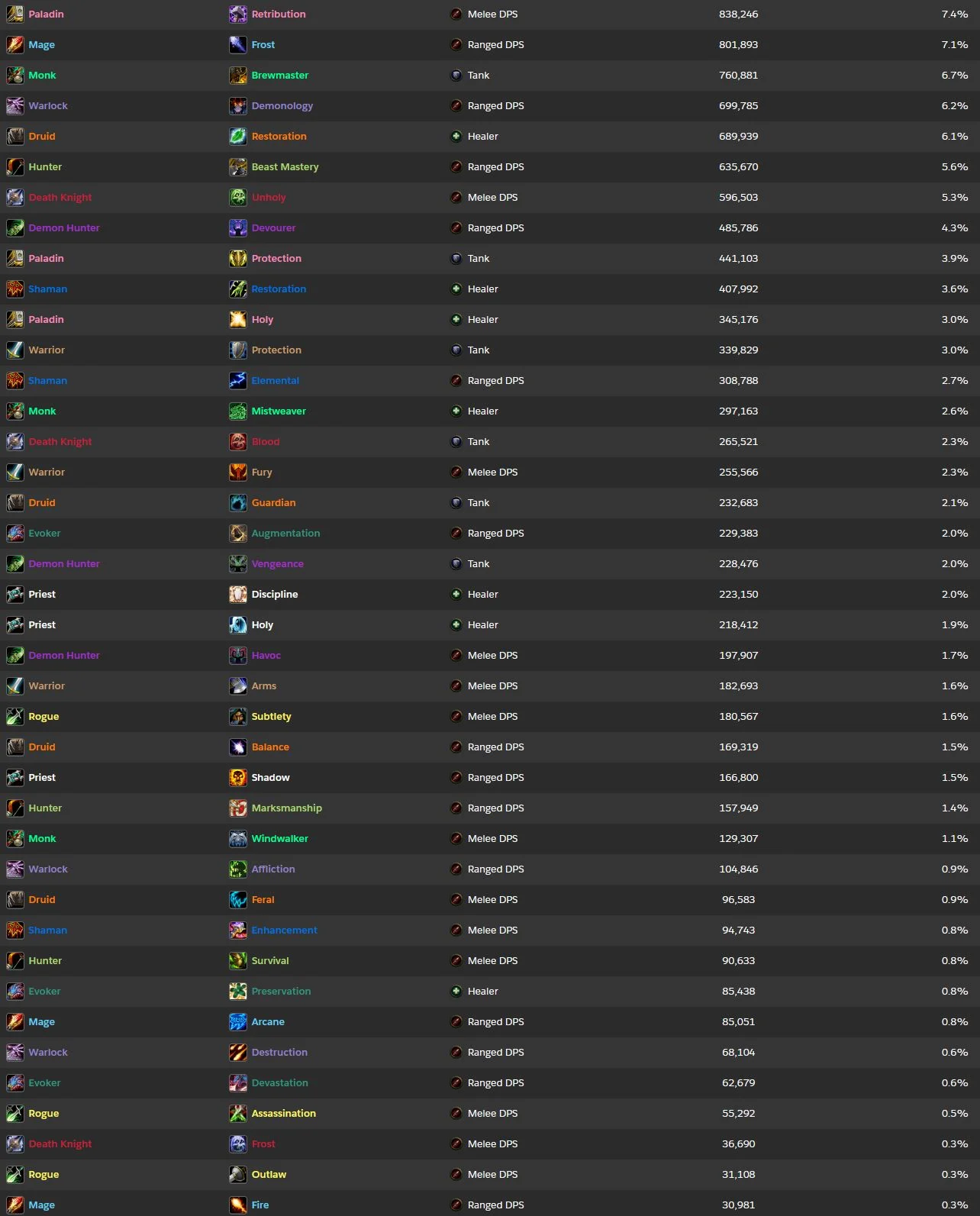 One of the most popular specs of all time is back on top here at the start of Midnight! Retribution takes up 7.4% of all specs this week and is solidly in the lead. Frost Mage isn’t that far off, however, sitting at 7.1%, followed by the most popular tank, which is still Brewmaster, even after the nerfs and buffs to other tanks. The third DPS spec comes in at No.4, with Demonology sitting at 6.2%, and the top healer closing out the top 5, with an almost identical 6.1%. We then have three more DPS specs, followed by two tanks and healers. It also seems only Frost is doing well for the Mages, as not only is Arcane very, very low in the chart, Fire is at the literal bottom, joined by Outlaw and Frost DK.