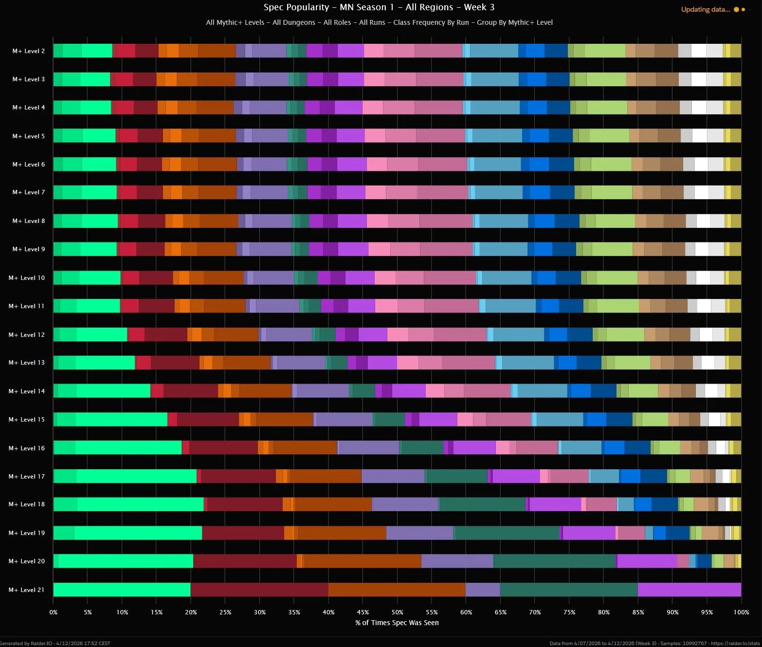 We’re already at a +21 top run here in week 3 of the season, but with only a few runs and only featuring 6 specs. The most popular tank and healer are joined by Unholy, Demonology, Augmentation, and Devourer.
