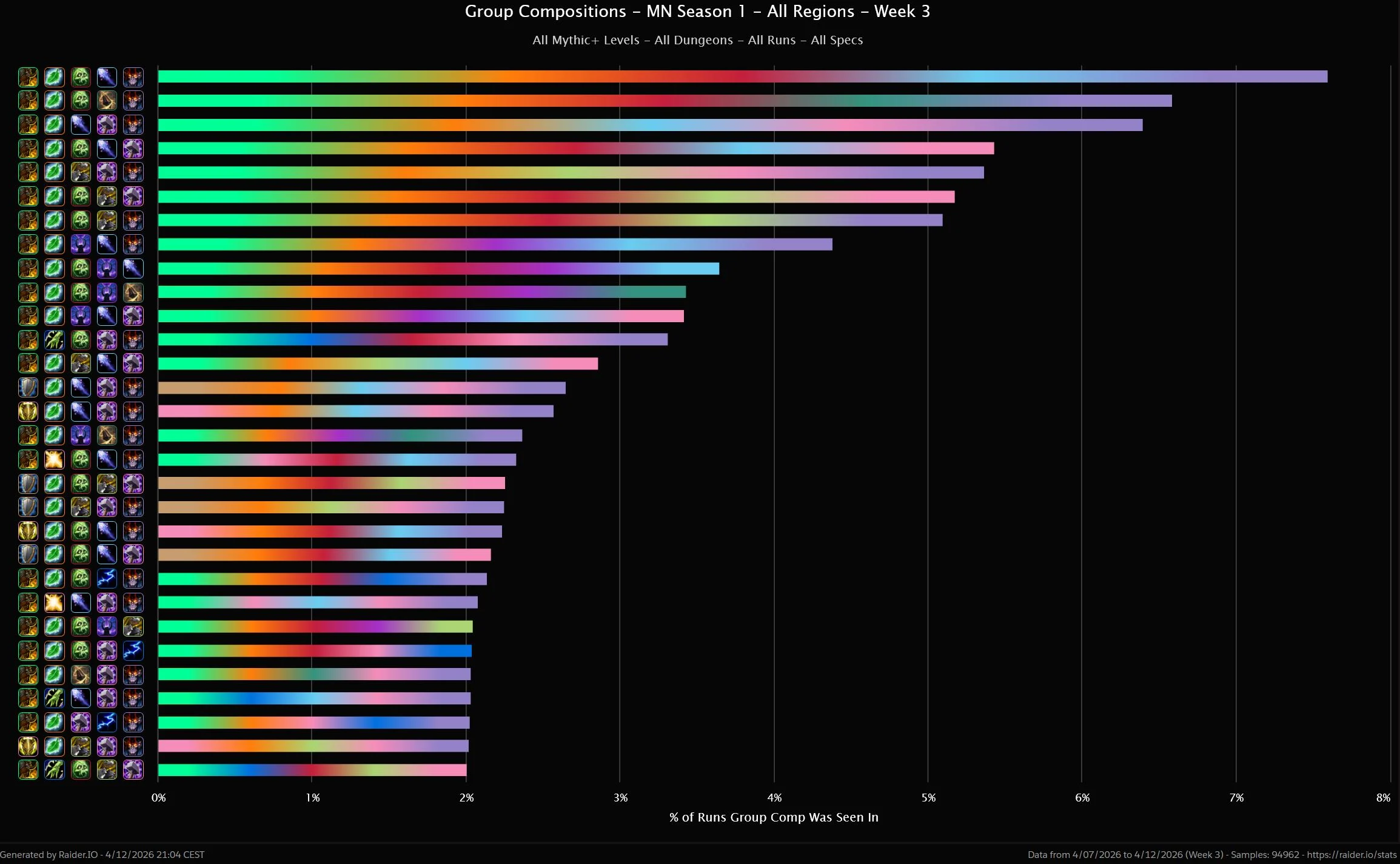 The top group is exactly 1% ahead of the 2nd, sporting the top tank and healer, as well as Unholy, Frost Mage, and Demonology, at 7.6%. Augmentation replaces Frost in the 2nd comp, and the 3rd, which is almost as popular, brings a Retribution Pala instead.